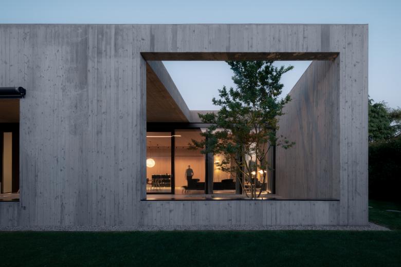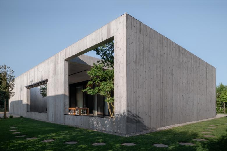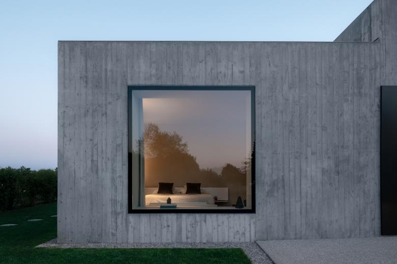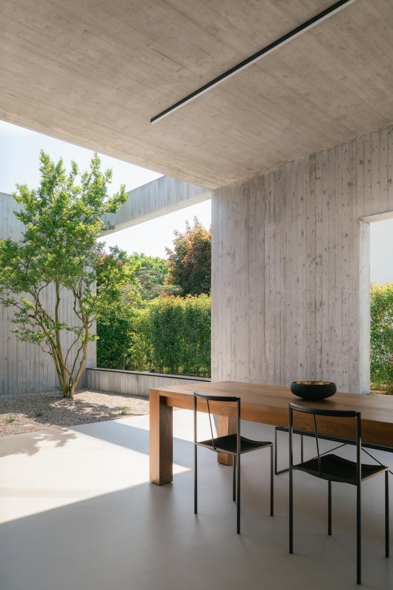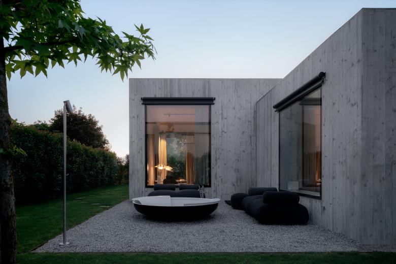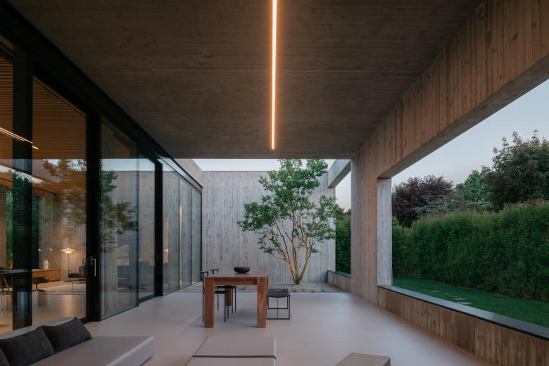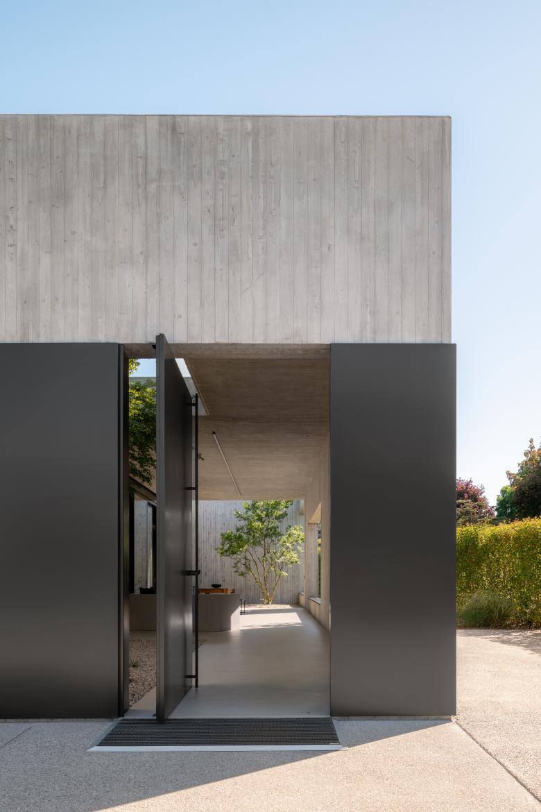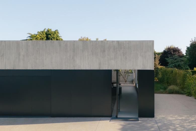 L’intervento si articola in due volumi in calcestruzzo a vista di differente altezza, disposti in modo da generare spazi fluidi, ariosi e intimi allo stesso tempo. Il volume più alto accoglie l’accesso principale, un ampio patio coperto e la zona giorno, concepita come un open space luminoso, che si apre sul giardino grazie a una grande parete vetrata. Il secondo volume, più basso, ospita la zona notte, raccolta e silenziosa, distribuita lungo un corridoio scandito da armadiature nascoste a tutta altezza.
