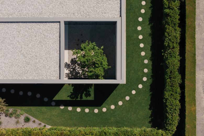 La pianta si struttura su tre fasce parallele, interrotte da corti e tagli verdi che introducono vuoti architettonici tra i pieni, rendendo la vegetazione parte integrante della composizione. L’ingresso, rivolto a nord, si configura come uno spazio di transizione tra il dentro e il fuori, grazie ad un importante portale d’accesso che si apre su un patio profondo e introspettivo, capace di dialogare con il paesaggio attraverso aperture strategiche per preservare la privacy dei suoi abitanti.