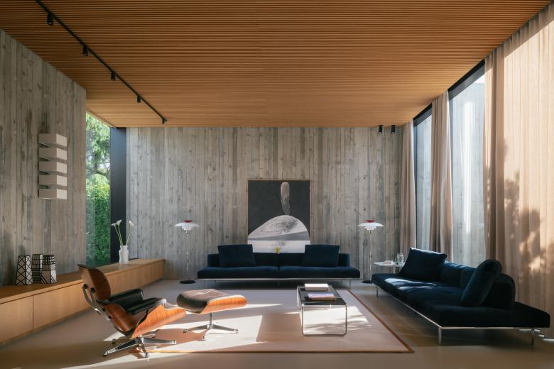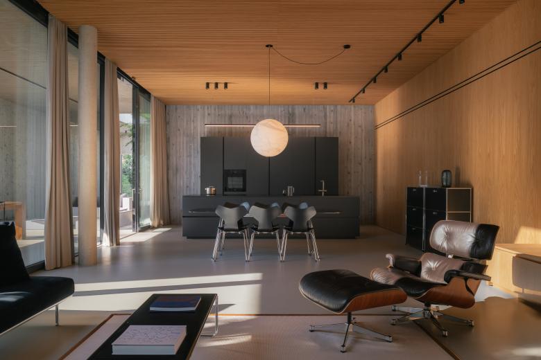 La pavimentazione in resina estende la matericità dell’esterno negli ambienti interni, sottolineando la continuità visiva e tattile. Il contrasto tra superfici dure del cemento faccia a vista e la calda presenza del legno, che riveste gli alti soffitti e una parete del soggiorno, contribuisce a creare un’atmosfera accogliente e sofisticata.