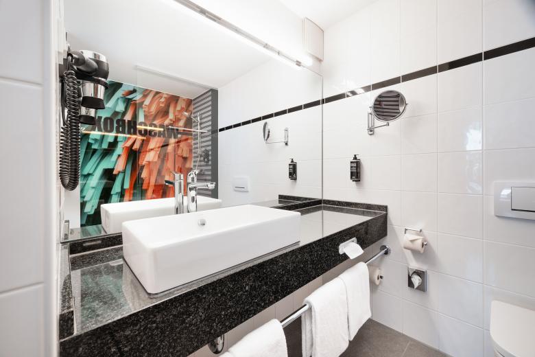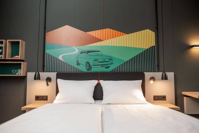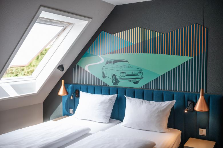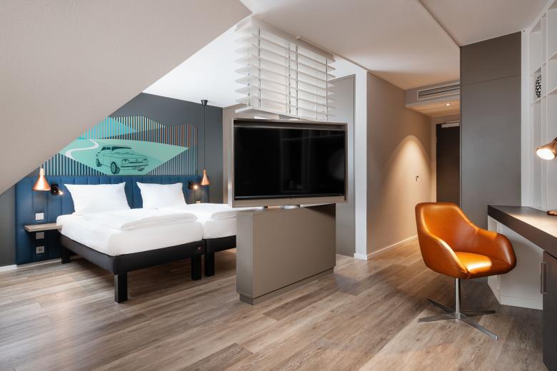 Das Designkonzept greift die beiden prägenden Themen Neckarsulms auf: Motorsport und Weinbau. In den Zimmern erwartet die Gäste ein dynamisches Motorsportambiente – mit großflächigen Wandgrafiken legendärer NSU-Fahrzeuge, carbonoptischen Bettkopfteilen und farbigen Akzenten, die an die Rennwagen der Vergangenheit erinnern. Ergänzt wird die Gestaltung durch einen eigens entworfenen Teppichboden, dessen Muster Reifenspuren nachempfunden ist und so eine subtile Bewegung in die Raumwirkung bringt. Selbst die Badezimmer sind Teil dieser Inszenierung: Die Duschbereiche erinnern in ihrer Gestaltung an Autowaschboxen und setzen das Thema auf charmante Weise fort. In den öffentlichen Bereichen und dem Meetingraum dominiert neben Motorsportakzenten eine ruhige, gastliche Atmosphäre. Warme Materialien, dekorative Weinfässer und stimmungsvolle Bildmotive in Sepiatönen greifen die Weinbaukultur auf, die für Neckarsulm ebenso typisch ist. So entsteht ein spannungsvoller Wechsel aus Dynamik und Gelassenheit, der den Gästen sowohl Erlebnis als auch Behaglichkeit bietet.