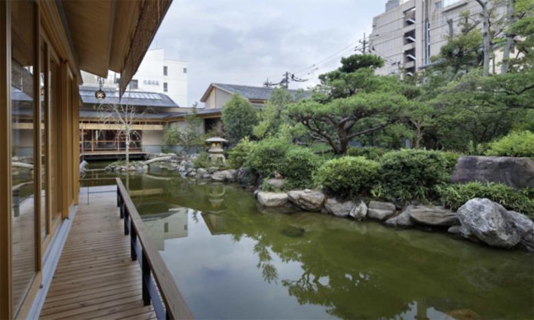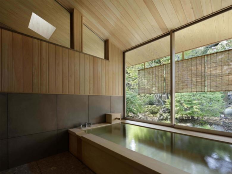 その鍵となったのが、2個で1セットとした客室である。2つの客室を坪庭でつないで一つの棟とした分棟形式を採用し、軸をずらしながら雁行させて配置。それによって、焼けることなく残った北側の庭と新しく設けた坪庭という二方向の庭に開くことが可能となった。トップライトを設けて基本的に三面採光とし、全居室だけでなくトイレでさえも自然光が入るようにした。
