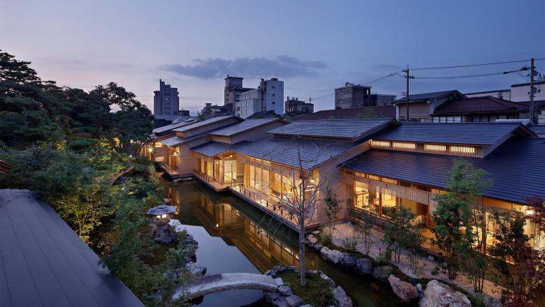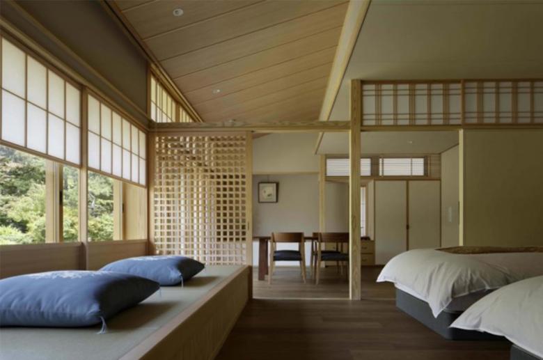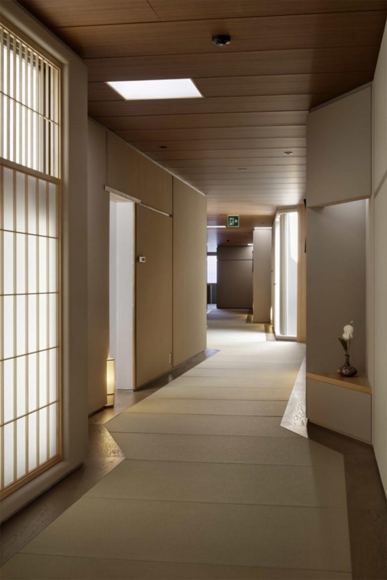 17室ある客室はすべて異なる意匠にしている。全室の間取りや意匠、仕上げをすべて変え、あえて差異をつくることで新旧が融合し、時間の経過を感じさせるデザインにした。坪庭がつなぎとなり時には緩衝帯となって、軸線を少しずつずらしながら奥へ奥へと建物が雁行していくさまは、かつてのべにや旅館を彷彿とさせるのではないだろうか。