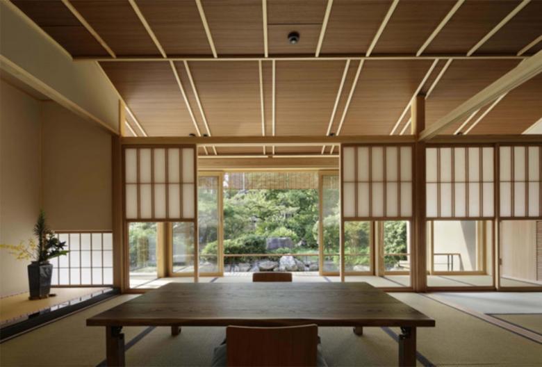 平屋建てなので北庭にも光と風が導かれ、水面に光が反射し、障子・すだれを通して柔らかい光が室内を満たす。九頭竜川に沿って流れる南北方向の卓越風を東西に延びる建物の配置によって受け止め、随所に開閉可能な建具を設けて各室にとり入れることで、自然と一体となる空間を実現している。