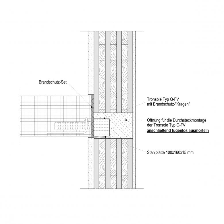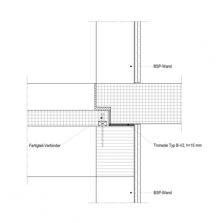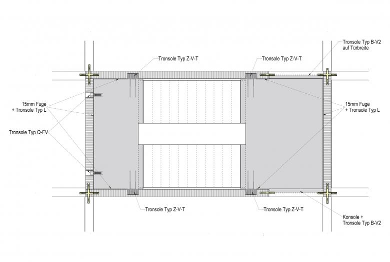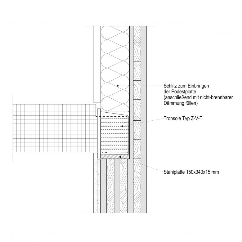 Um die Anforderungen von 53 dB an den Trittschallschutz der Treppen einzuhalten, wurden zur Entkopplung des Flucht-Treppenhauses verschiedene Typen von Schöck Tronsole eingesetzt: In der rückwärtigen Wand wurden zwei Trittschalldämmelemente vom Typ Q eingebaut. In den seitlichen Wänden kam Tronsole Typ Z zum Einsatz. Beim Hauptpodest wurden an der Vorderseite jeweils zwei Tronsole Typ Z sowie längs auf der Treppenhauswand zwei Tronsole Typ B eingebaut.