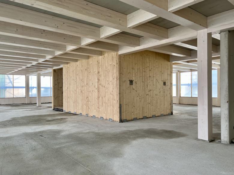 Deshalb wurde der Erweiterungstrakt in Holzhybridbauweise realisiert – eine für Norddeutschland bislang eher ungewöhnliche Bauweise. Der Skelettbau mit Holzstützen und -hauptträger ruht auf einem massiv hergestellten Untergeschoss. In den Geschossen darüber wurde vor allem der Baustoff Holz verwendet.