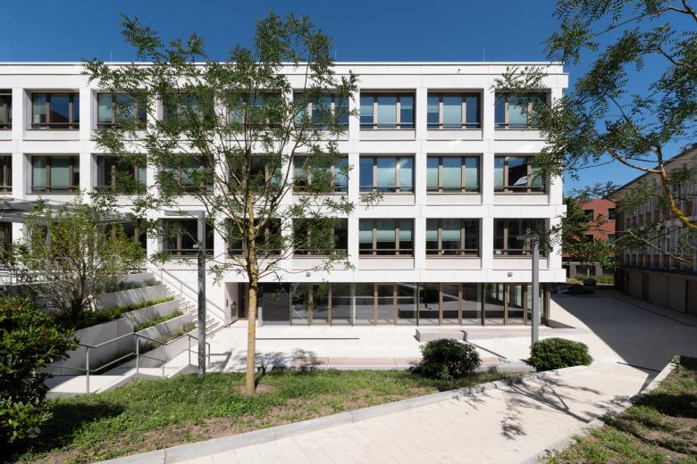 Das Bürokonzept vereint über drei Geschosse 44 Einzel- und sechs Doppelbüros sowie eine Multifunktionszone mit sieben geschlossenen Besprechungsräumen für einen ungestörten Austausch. Ein Gang auf Höhe des ersten Obergeschosses schafft die Verbindung zum historischen Haupthaus. Die kompakte und durchdachte Form des Neubaus erlaubt zudem im Bedarfsfall eine nachträgliche winkelförmige Erweiterung.