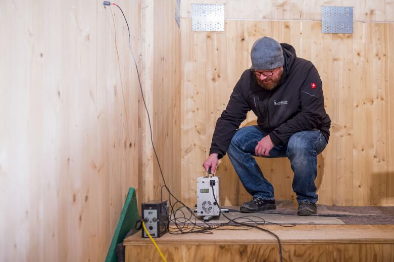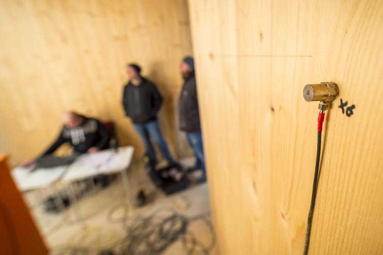 Die erste Messung wurde im Rohbaustadium, als die Trockenbau-Wände noch nicht erstellt waren, vorgenommen und erfolgte daher über Körperschallaufnehmer anstatt über eine direkte Luftschallmessung mittels Mikrofon. „Körperschallaufnehmer sind Schnellepegelmesser, die auf die Holzbetonverbunddecke geklebt wurden. Das war das einzige Bauteil, das in den Raum abstrahlen konnte“, erklärt Christoph Fichtel.