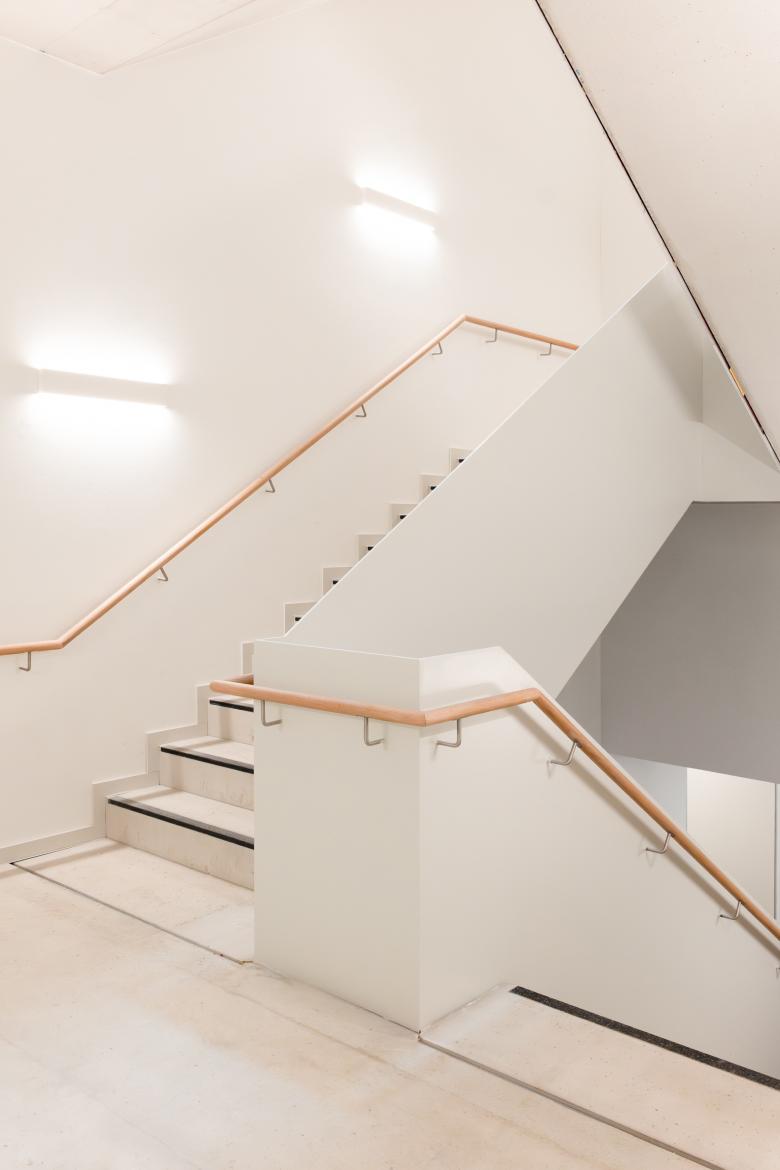 Stahlbeton kam nur für die Fertigteilelemente in der Holzbetonverbunddecke, für den Aufzugsschacht und für die Treppenläufe des Flucht-Treppenhauses zum Einsatz. Während die Treppenhauswände für die räumliche Aussteifung und den vertikalen Lastabtrag in Massivholz ausgeführt sind, wurden die Betonfertigteiltreppenläufe und -podeste aus Brandschutzgründen aber auch als kostengünstige, robuste und optisch ansprechende Lösung eingebaut. Bei den Wänden handelt es sich um Cross-laminated-Timber-Wände, die – ebenfalls aus Brandschutzgründen – mit 2x 2-lagen Gipskarton verkleidet sind. Treppenläufe aus klassisch grauem Sichtbeton, ein filigranes, weißes Blech mit Holzhandlauf als Geländer im Treppenauge und Granitnaturstein für die nötige Trittsicherheit im vorderen Teil der Treppenstufen sorgen hier für eine hochwertige Ausführung.