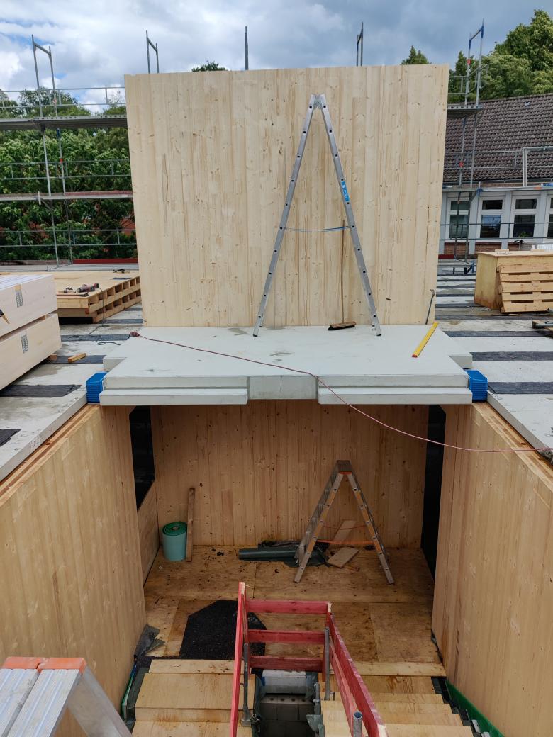 Der Einsatz des Trittschalldämmelements im Holzhybridbau ist ein Novum, wie Liam Owen Winckler von DREWES + Speth berichtet: „Der Erschließungskern und das Treppenhaus werden im Holz- und Holzhybridbau in der Regel aus Massivbeton erstellt. Dabei ist für die Montage und den Bauablauf eines Holzbaus eine konsequente vertikale Tragstruktur aus Holz wenn möglich die zielführendste Lösung. Somit hatten wir es mit einem Stahlbeton Massivtreppenlauf an Massiv-Holzwänden zu tun. Wir standen daher vor der Frage, ob eine Tronsole die Entkopplung und damit den Schallschutz sicherstellen kann.“ Zur Klärung wandte sich der Ingenieur an die Mitarbeiter von Schöck, die auch sofort bereit waren, zu helfen. „Das offene Ohr, schnell technisch zu unterstützen, zeichnet Schöck ja generell aus“, sagt Winckler. Ausschlaggebend für ihn, den Versuch zu wagen, waren die sehr guten Trittschallkennwerte von Schöck Tronsole, die viel Luft nach oben haben sowie das Vertrauen in die Expertise des Herstellers.