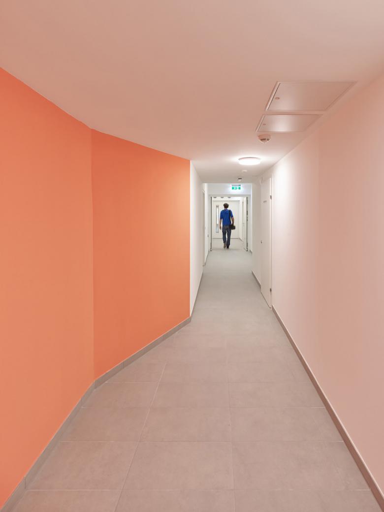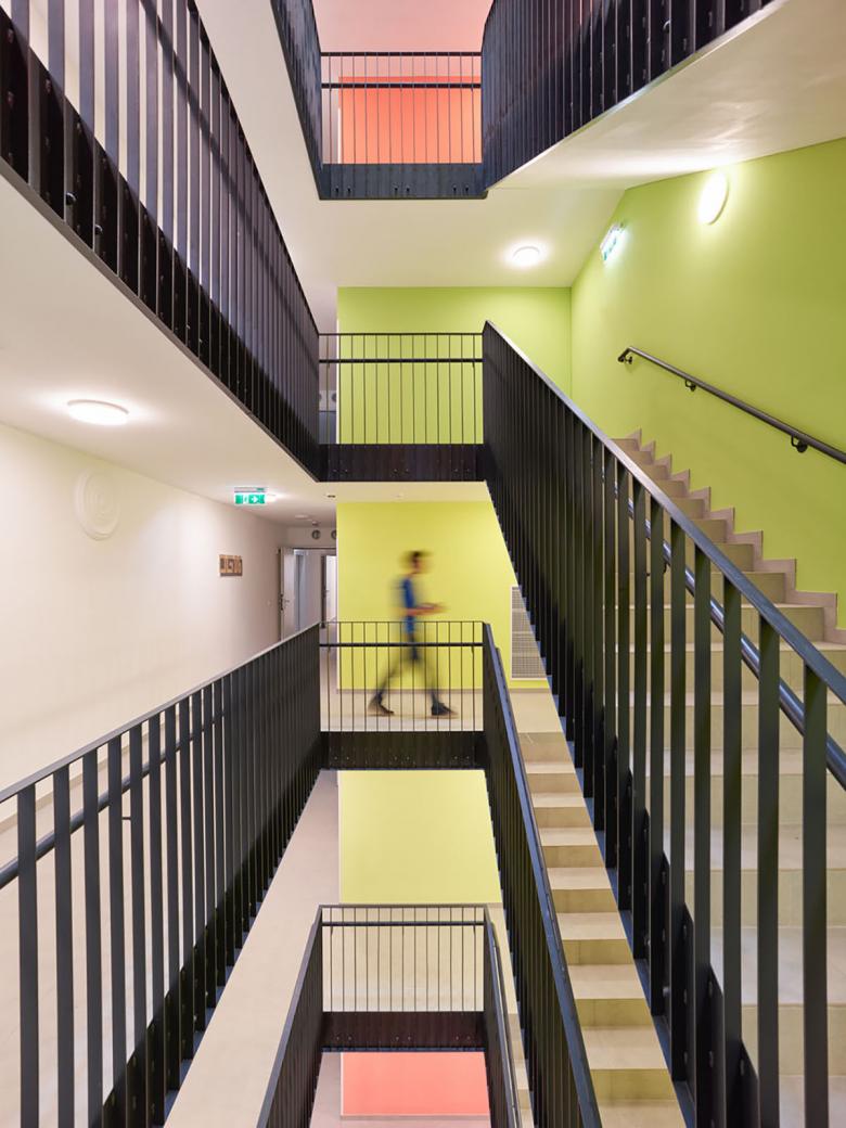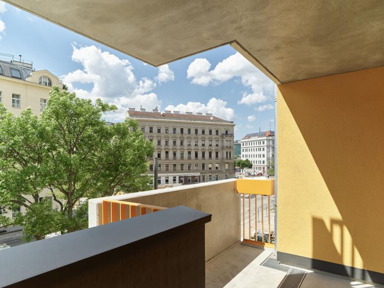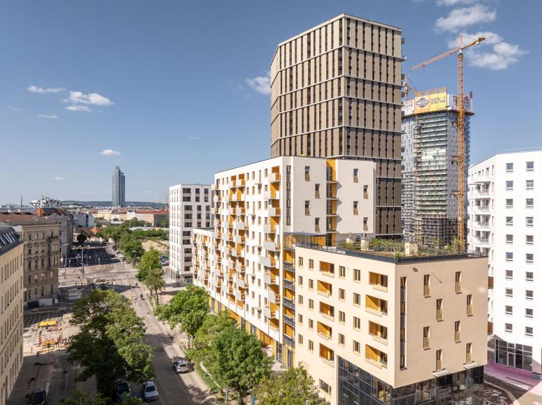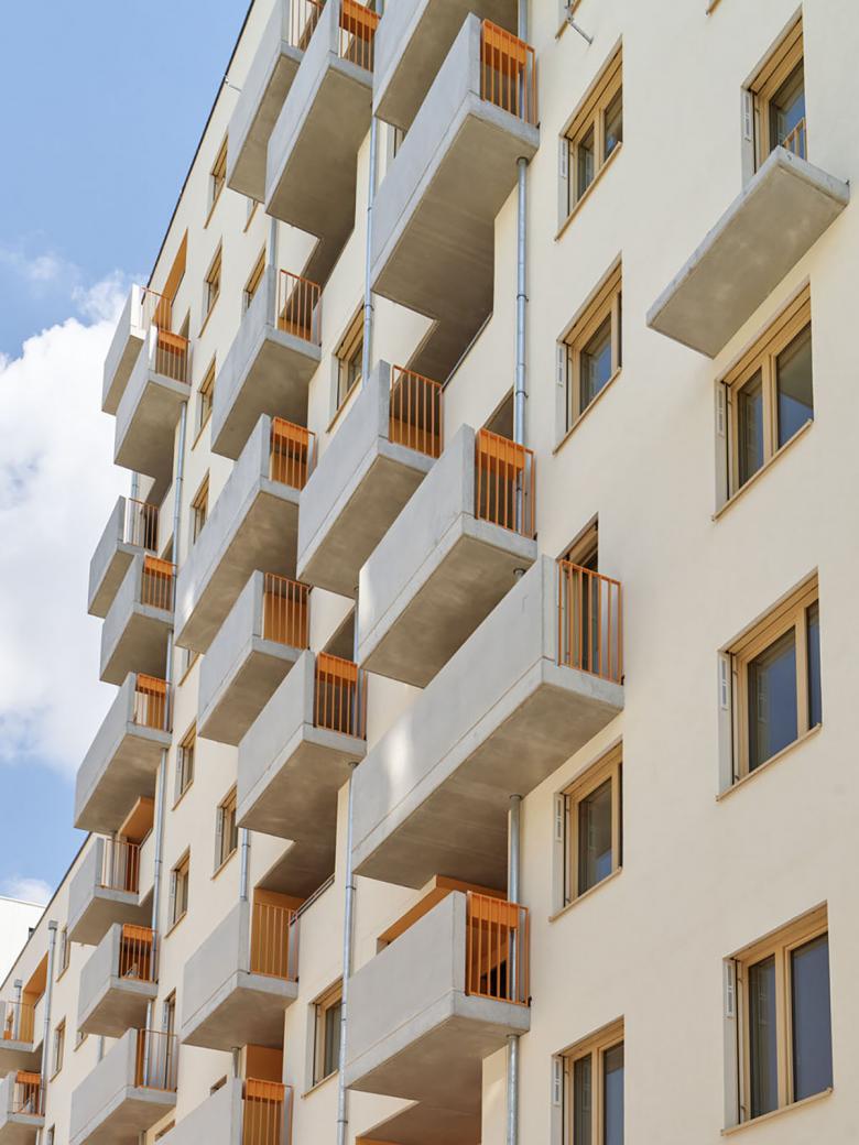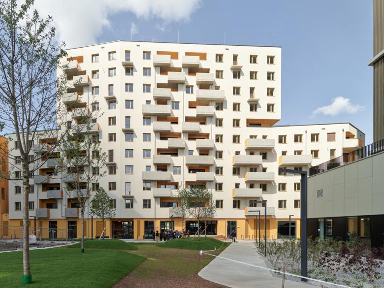 Das Lang-Haus kombiniert und vereint modernes Wohnen, soziale Interaktion und naturnahe Gestaltung. Das Design besticht in der Form eines gespiegelten „L“ und hat funktionale Vorteile: Das „L“ öffnet den Baukörper in Richtung der grünen „Freien Mitte“ und sorgt durch Einschnitte und versetzte Ebenen für Freiräume und spannende Blickbeziehungen. Vom großzügig angelegten Foyer bis hin zu den Gängen und Stiegenhäusern überrascht das Gebäude mit warmen Pastelltönen, die sich in jedem Stockwerk unterscheiden. Die verspielte Fassadengestaltung, geprägt durch versetzte Loggien, Balkone und Pflanztröge, unterstützt das abwechslungsreiche Erscheinungsbild und bietet sonnige, schattige oder sichtgeschützte Bereiche. Das z.T. smarte Wohnhaus überzeugt durch seine nachhaltige Bauweise: Extensiv begrünte Dachflächen und Photovoltaikanlagen tragen aktiv zum Umweltschutz bei. Gleichzeitig sorgen effektive Sonnenschutzeinrichtungen und Lüftungssysteme für ein angenehmes Raumklima – ganz ohne sommerliche Überhitzung. Die insgesamt 115 geförderten Wohnungen (davon 29 Smart) werden in den Geschoßen 1 bis 10 in unterschiedlichen Größen und Förderschienen bunt gemischt.