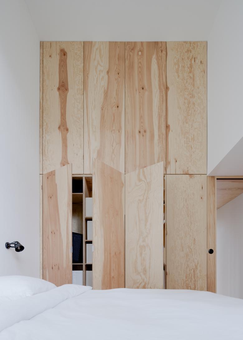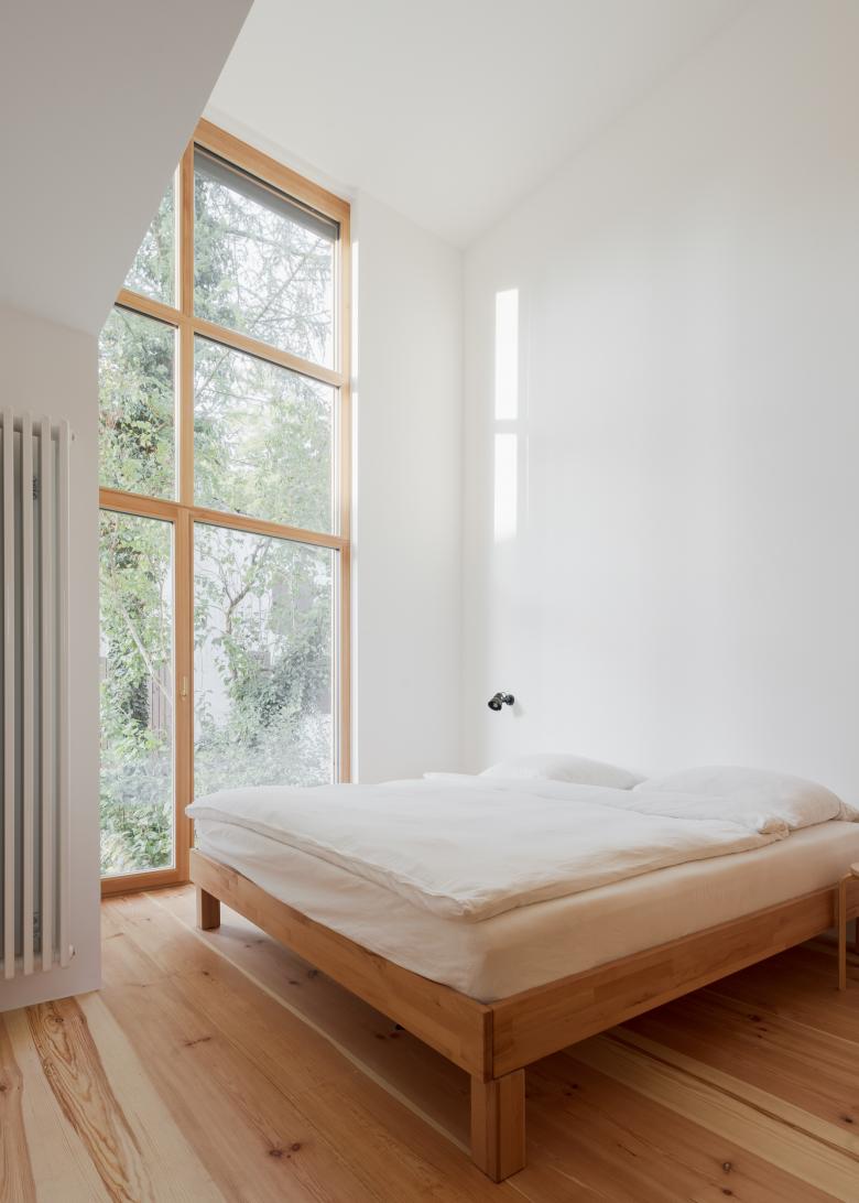 Eine funktionale, minimalistische Ästhetik prägen auch das Innenleben des Hauses. Die hellen Holztöne der Treppe, Schränke und Böden verleihen den Räumen Wärme. Diese Materialwahl trägt zur ruhigen und natürlichen Anmutung des Hauses bei und unterstreicht die Verbindung zur umgebenden Natur. Bemerkenswert sind auch die großen Fensterflächen, die nicht nur viel Tageslicht einlassen, sondern auch den Blick auf die umliegende Landschaft freigeben und die Räume mit der Außenwelt verbinden.