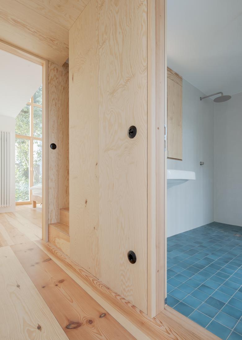 Tritt der Besucher aus dem Wohnzimmer auf die Gartenterrasse hinaus, findet er dort – holzverschalt und nicht gleich ins Auge springend – ein schmuckes Nebengebäude mit Sauna und Außendusche. Die klare Gestaltung mit hellem, unbehandeltem Holz, schafft auch hier eine beruhigende Atmosphäre für Bewohner und Gäste, die sich im geschützten Raum erhitzen oder – neben der mächtigen im Inneren der Außendusche emporwachsenden Kiefer – abkühlen mögen.