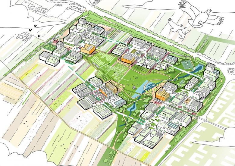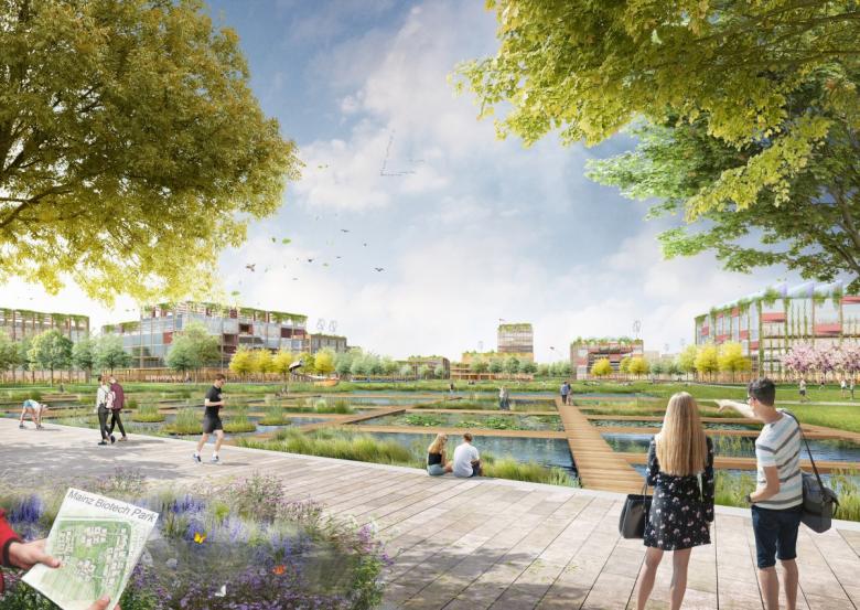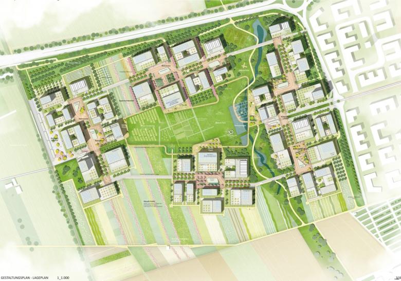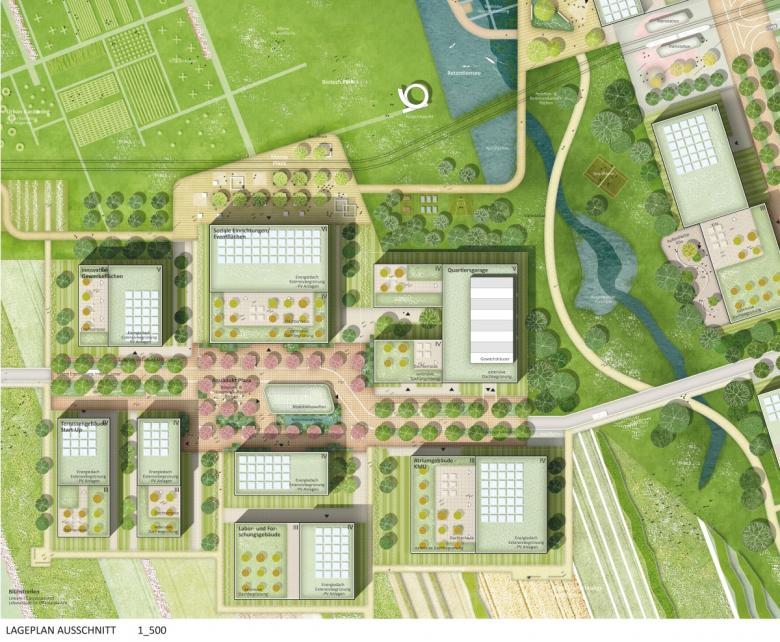 Die städtebauliche Grundstruktur besteht aus vier Clustern, die durch eine intensiv durchmischte Nutzungsverteilung alle autark funktionieren und eine „Stadt der 5 Minuten“ ermöglichen. Die Baufelder sind entlang der ringförmigen „Clusterachse – der Schwammstraße“ angeordnet, die durch Mobilitätspavillons in den Zentren der Achsen auf den Klimaplazas als Treffpunkt gelten.