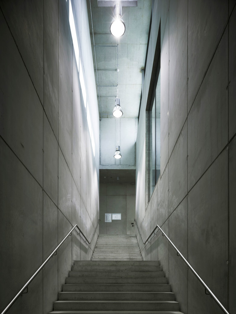 Die Haupttreppe verbinden die Geschosse, um eine kreuzungsfreie Erschließung zu ermöglichen. Der vollständig verglaste Speisesaal für 600 Gäste ist stützenfrei, um auch große Veranstaltungen zu ermöglichen.