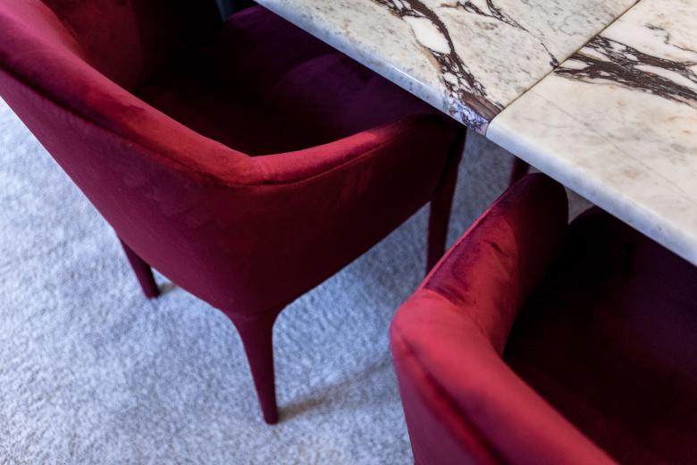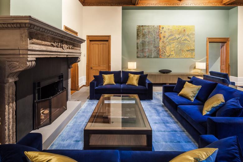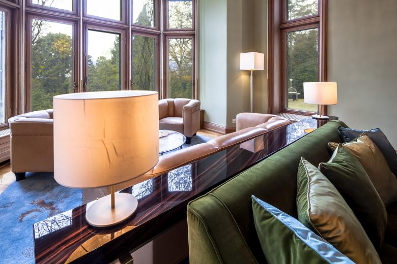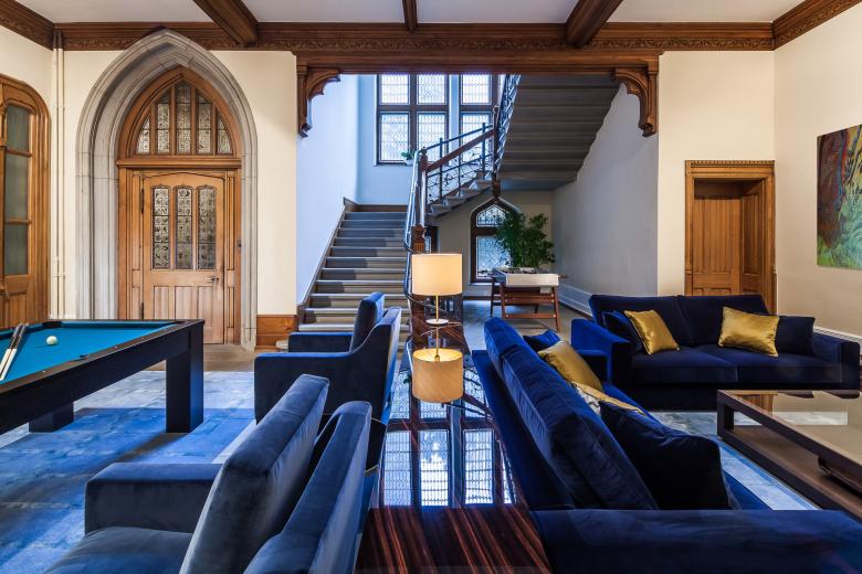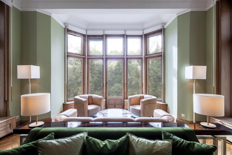 The Mid-19th century NEO-GOTHIC VILLA is a jewel hidden in the hills of the elite Gold Coast of Zurich. We refurbished interior and simultaneously preserved historical building. The selected materials and a jewel-toned colour palette set the environment warm. The pool billiard and foosball table form a contrast to the living area with fireplace and yet a relaxed environment prevails. The soft blue and green tones combination of the salon is accentuated by the lush garden in the background. The subtly gold-painted wall enhances the flamboyant dining room arrangement of eight velvet clad chairs surrounding a bespoke customised marble table. More at https://www.studioforma.ch/architecture-projects/interior-design/neo-gothic-villa