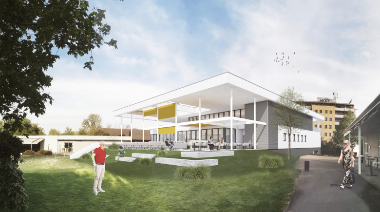 Das Projekt nimmt mit den Fassaden die Ausrichtung/Achsen der angrenzenden Bauten auf. Durch die bestehenden Pavillons ist der Bezug zum Golfplatz eingeschränkt, was den Vorschlag bestärkt, die Terrasse und damit den Sichtbezug zum Platz in der Höhenlage beizubehalten. Dank dieser Höhenanordnung steht das neue Projekt zentral und leicht über der gebauten Umgebung. Das Projekt nimmt mit Form und Materialwahl Bezug auf die bestehenden Gebäude. Helle, offene, flexible Räume mit Sicht nach Aussen und Innen führen zu Grosszügigkeit. Kurze Wege sollen das Arbeiten erleichtern.