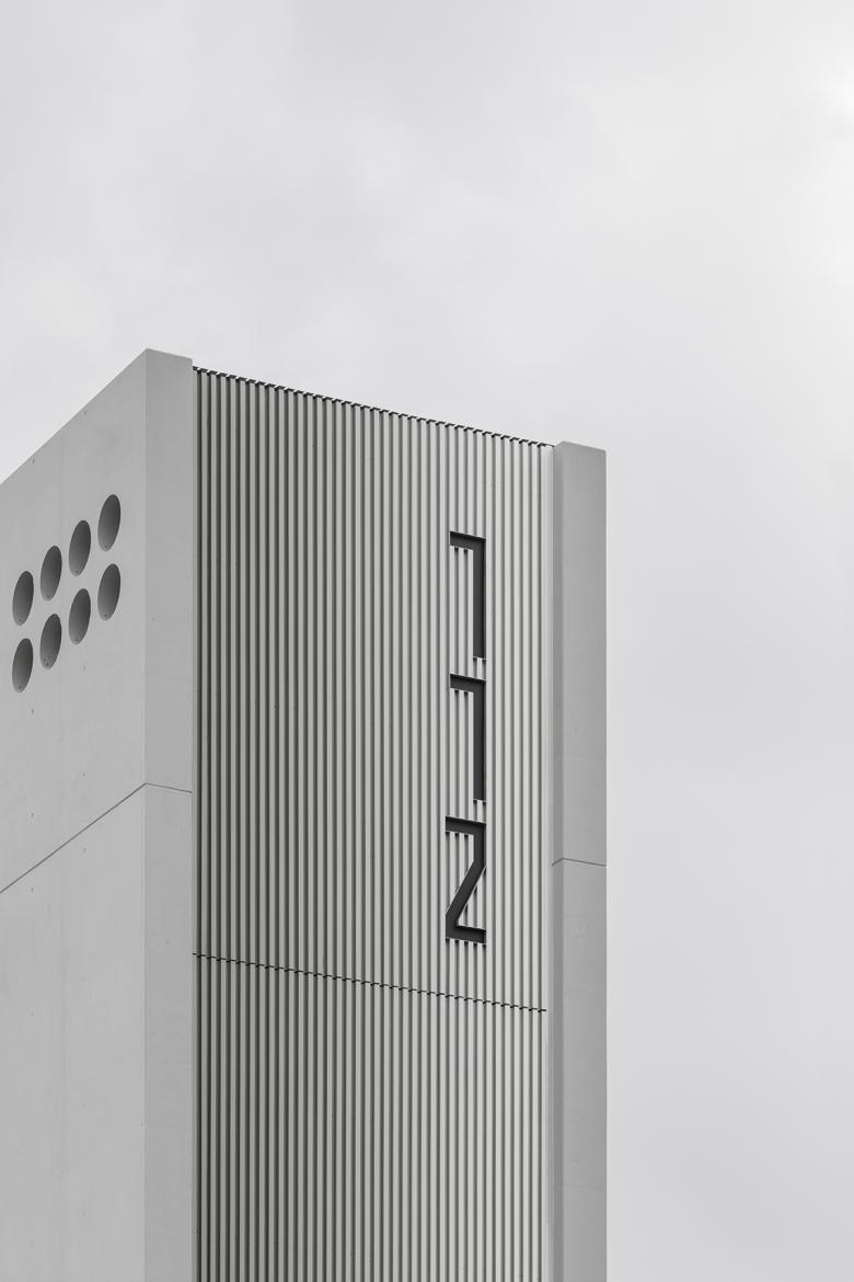 Die unterschiedlichen Gebäudeteile und der Schlauchturm werden durch eine einheitliche Materialität zu einer Gesamtanlage zusammengefasst. Einen spannungsreichen Kontrast bilden die großflächigen geschlossenen Wandflächen zu den Verglasungen der Fenster- und Torflächen.