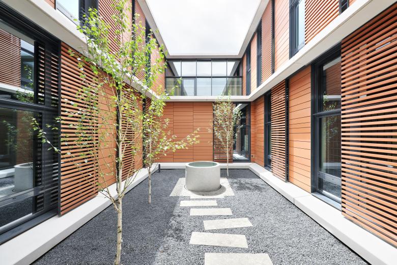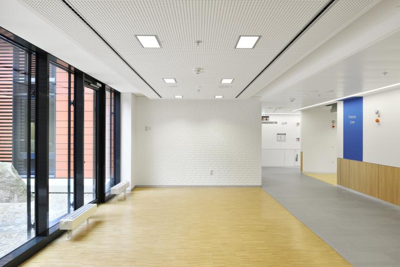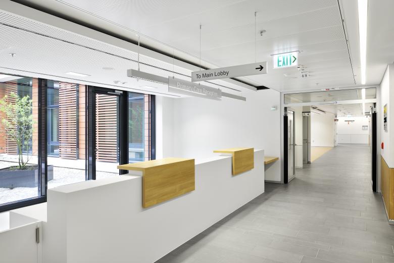 Über ein Eingangsgebäude wird ein zweigeschossiger Neubau auf der Süd-West-Seite mit dem bestehenden Klinikgebäude verbunden. Die vertikale Erschließung des rund 58 x 33 m großen Gebäudes ist unmittelbar dem Haupteingang und dem Empfangsbereich zugeordnet. Dies ermöglicht eine klare Orientierung zu den einzelnen Funktionsbereichen bei kurzen Wegeführungen. Der Haupteingang im Gelenk zwischen Neu- und Altbau ist direkt auf den erweiterten und neu gestalteten Parkplatz ausgerichtet, von dem eine beschrankte Vorfahrt bis zu den Gebäuden geführt wird. Notaufnahme sowie Ver- und Entsorgungszugänge, auf der Rückseite der Gebäude angeordnet, werden über eine separate, überarbeitete Zufahrt gemeinsam mit den Nebeneingängen der vorhandenen Dental Clinic angebunden, interner und Patientenverkehr bleiben damit vollständig getrennt. Die Zweigeschossigkeit des Neubaus erlaubt bei kompakter Bauweise eine klare und übersichtliche Erreichbarkeit der verschiedenen Funktionsbereiche, ohne dass Besucherverkehr an Behandlungseinheiten vorbei oder durch diese hindurchgeführt werden muss. Die Verteilerfunktion wird dabei in beiden Ebenen von einer „Mall“ übernommen, die mittig an die zentrale Vertikalerschließung des Gebäudes angebunden ist. Mit der Anordnung von drei gestalteten Innenhofbereichen wird trotz kompakter Bauweise eine ausreichende Belichtung aller Räume mit ständigen Arbeitsplätzen erreicht, auch wird damit die Orientierung im Gebäude erleichtert. Das Gebäude verfügt über eine komplexe technische Ausstattung mit Lüftungsanlage, Sprinklerung, Brandmeldeanlage, LED-Beleuchtung etc. Die bauzeitlich gültige EnEV wurde um 30% unterschritten. Das Gebäude wurde LEED Silber zertifiziert.