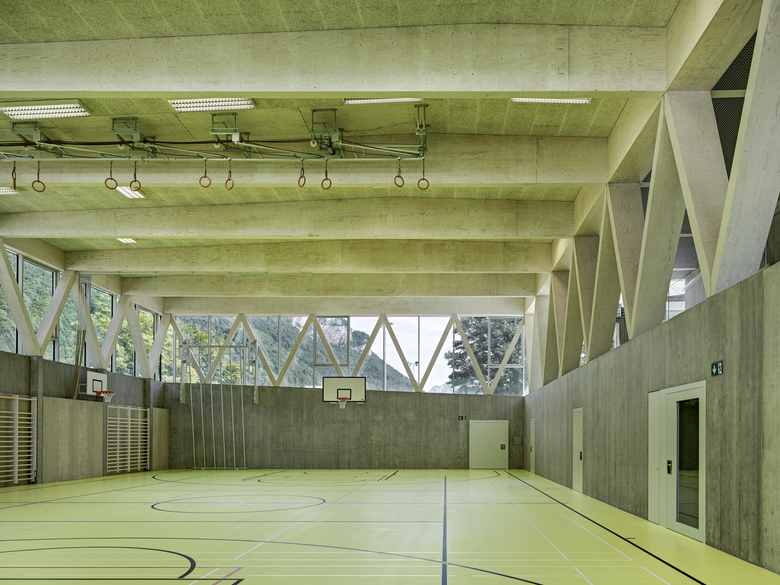 Konstruiert ist die Halle als Holzfachwerksbau mit Trägern und Stützen in vorfabrizierten Kerto-Holzelementen. Eine Statik, welche in der gewählten Form, den Holzbau gestalterisch wirksam macht, verbindend zwischen Dach und Fassade vermittelt und ein optimiertes Gesamttragwerk für das ganze Haus zur Folge hat. Von Aussen wirken der im Terrain verankerte Sockel aus lasierten Beton, zusammen mit dem umlaufenden Verglasungselement als Pfosten-Riegelsystem und der mit Spenglerblech verkleideten Dachkonstruktion als ruhiger Dreiklang der Materialien und lassen das innere hölzerne Gerüst nach aussen wirken. Die Siebbedruckung des Glases sowie deren technische Qualität bieten nebst Aussicht und Ausdruck, optimale Belichtung für den Sportbetrieb ohne Blendeinwirkung.