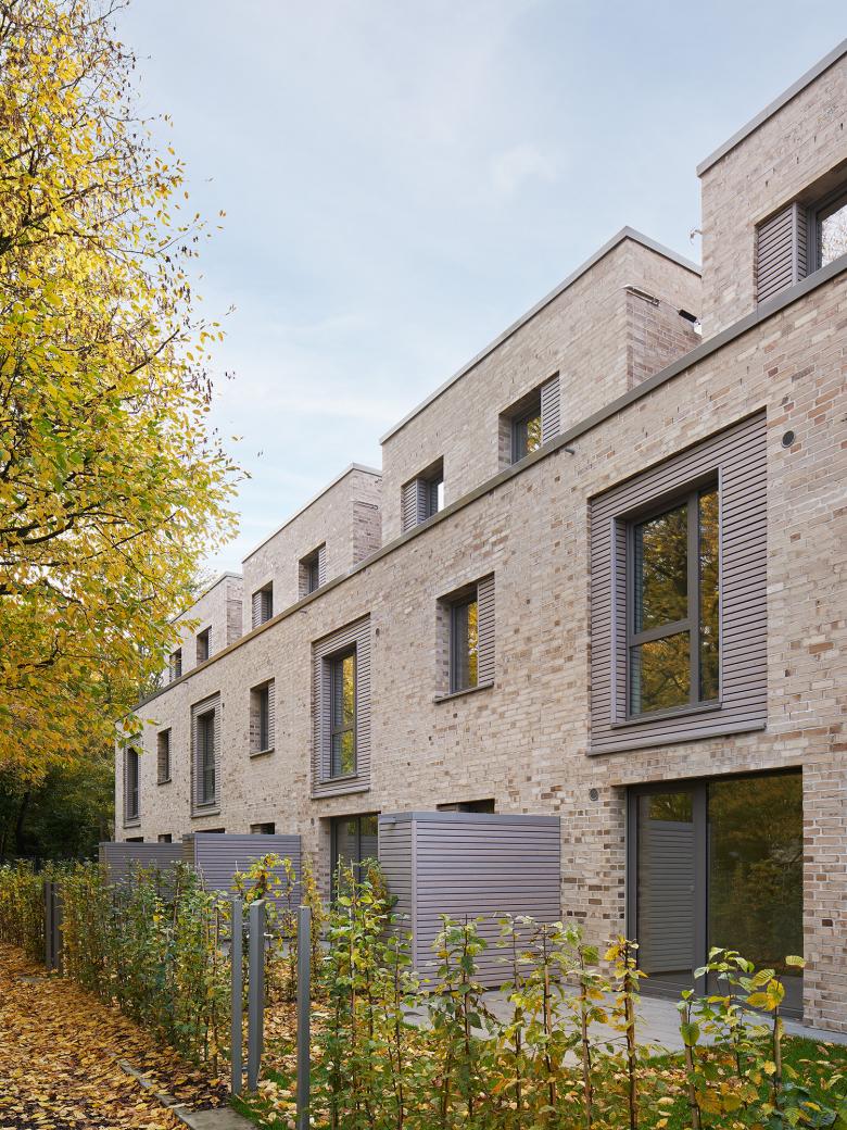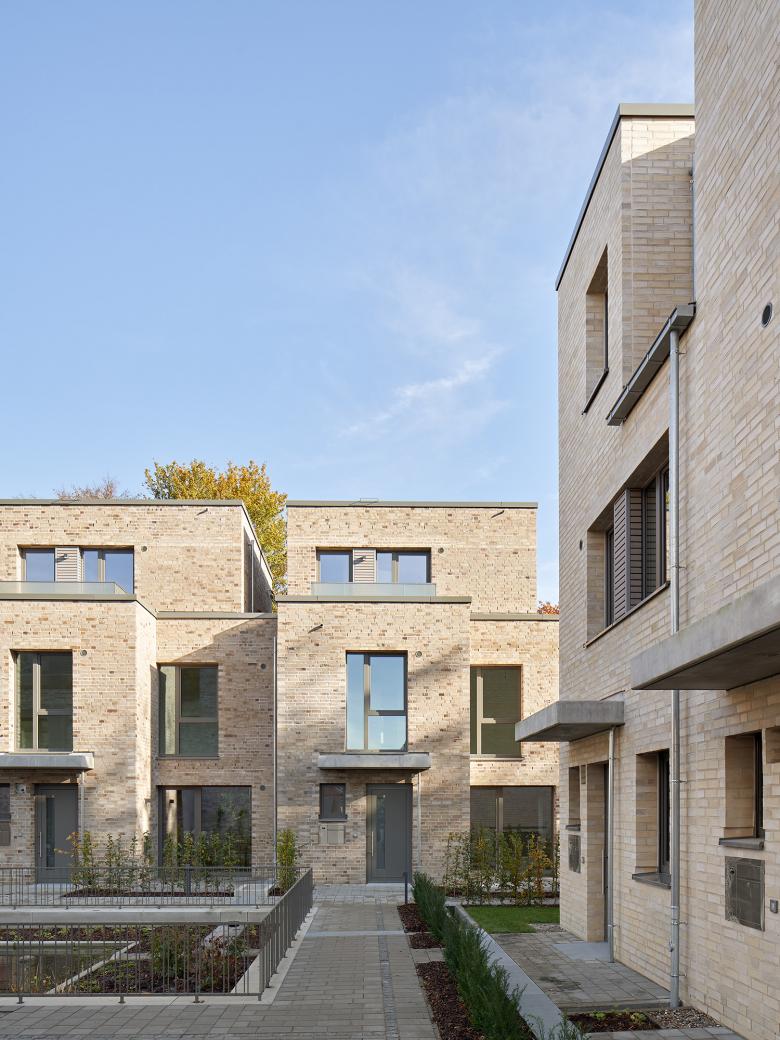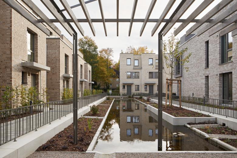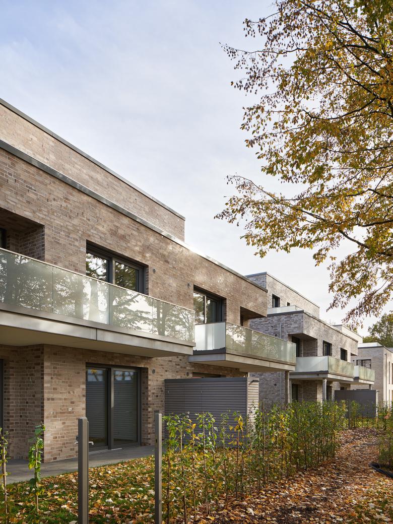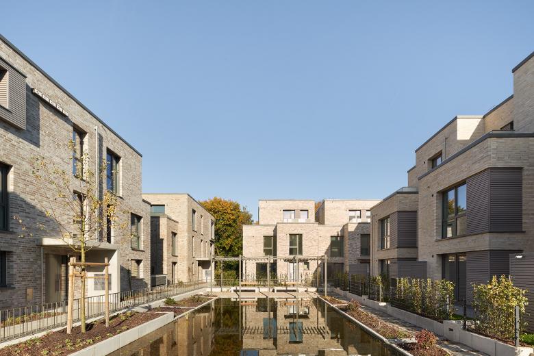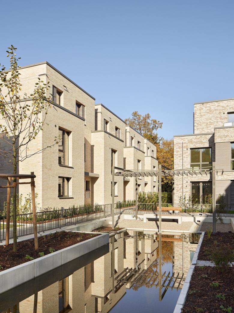Das gemeinsam entwickelte Konzept sieht eine Erschließung per Stichstraße mit Quartiersplatz vor. Dadurch bleibt die imposante Baumkulisse des Areals weitgehend erhalten. Die 29 Stadthäuser und vier Stadtvillen mit jeweils fünf Wohnungen gruppieren sich um zwei Wohnhöfe mit großzügigen Wasser- und Grünflächen.