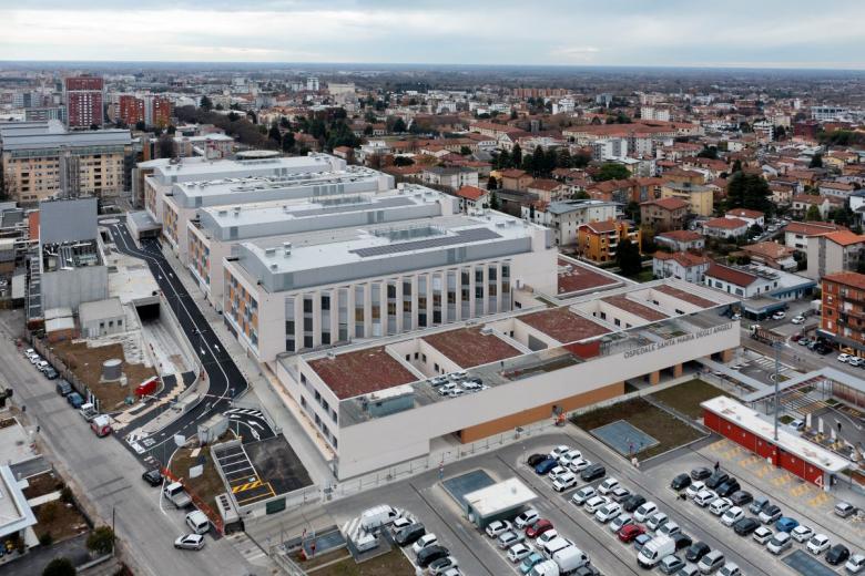 El recinte hospitalari de Pordenone està localitzat en una zona urbana consolidada, limitada per un mur opac i constituït per diversos pavellons de diferents èpoques. El nou edifici es troba dins d’aquest recinte i es proposa com l’espai d’obertura de l’hospital a la ciutat. Per aquest motiu, s’ofereix l’oportunitat de visitar l’estructura per a fer ús de les zones comuns: prendre un cafè, visitar una exposició o comprar flors