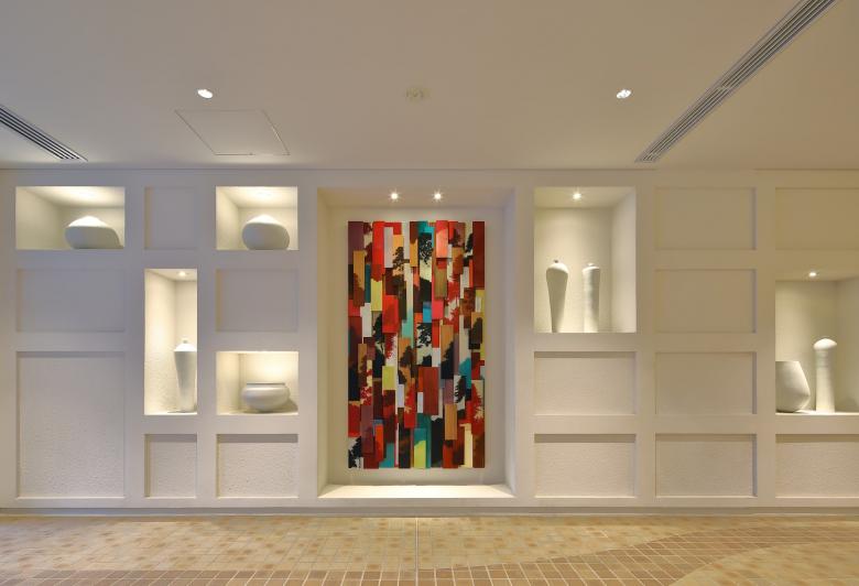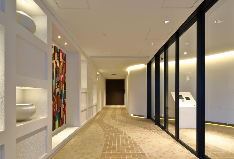 エントランス空間は白を基調としたシンプルなデザインで、外装の柔らかい印象とコントラストをつけて壁面に施した箱状の凸凹にアートを展示することで、小さなアートギャラリーのあるエントランススペースとなっている。