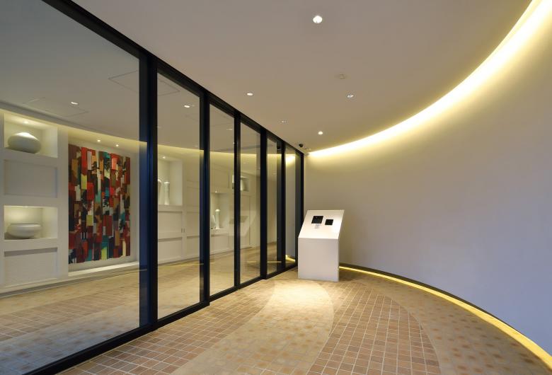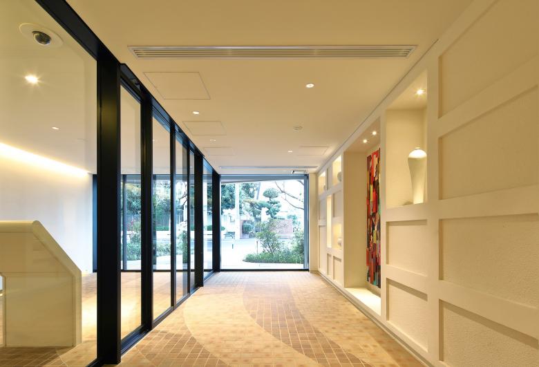 動線の流れを意識した形状と、空間にアートギャラリーのような機能を与えることで、見て楽しむエントランスとした。