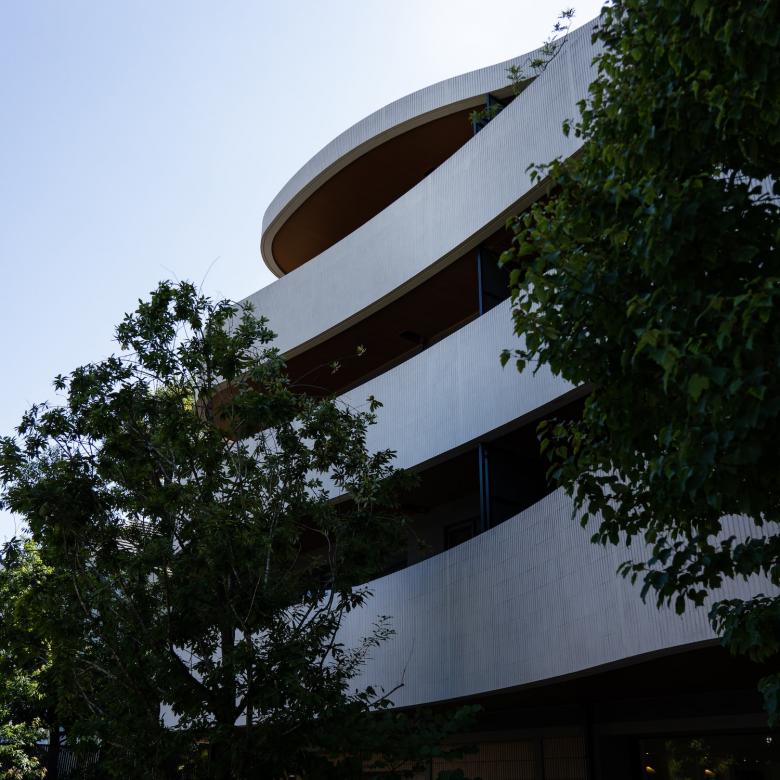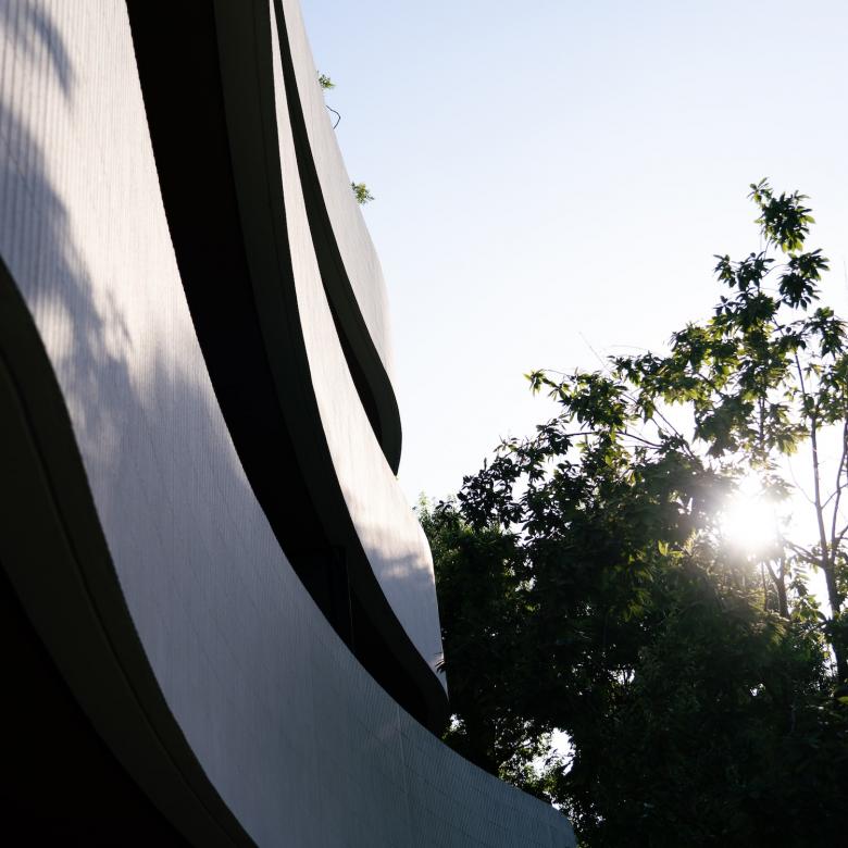 白いリボン状のバルコニーのカーブラインは建物に巻きつくような動きを生み出し、周辺の豊かな緑に映えて建物に新鮮な美しさと優しい印象を与える。