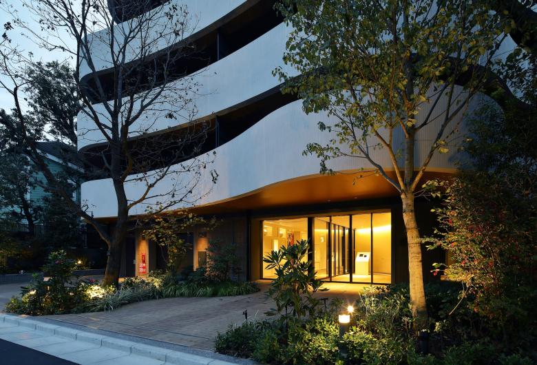 駒沢公園から程近くに計画された5階建ての共同住宅。駒沢公園のパークライフや周辺に緑が多い住宅地の静かでゆったりとしたエリアの立地条件から、有機的で柔らかい印象を大切に、外装デザインは各階で変化するバルコニーのカーブラインが建物全体の印象を柔らかくダイナミックなゆらぎを感じさせるデザインとしている。