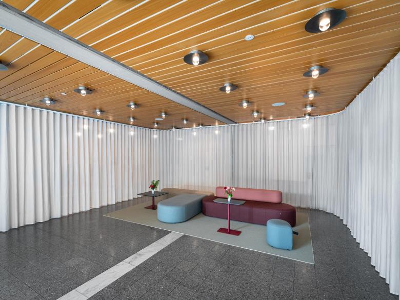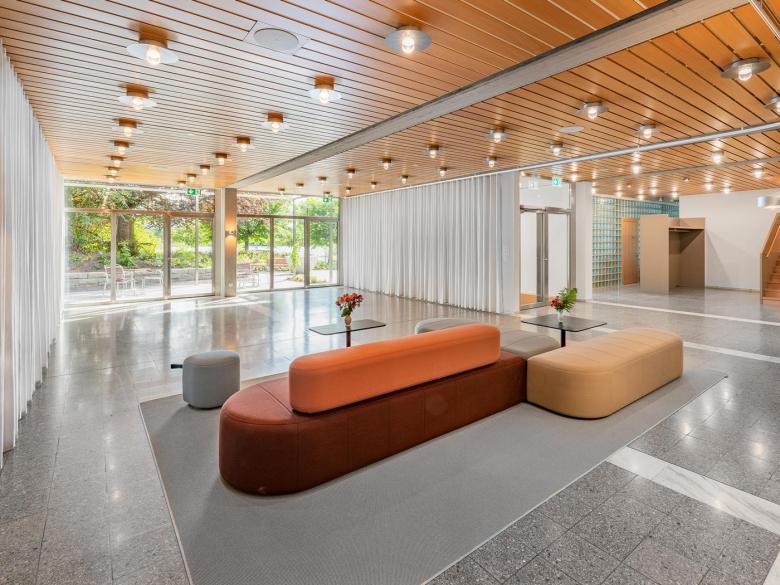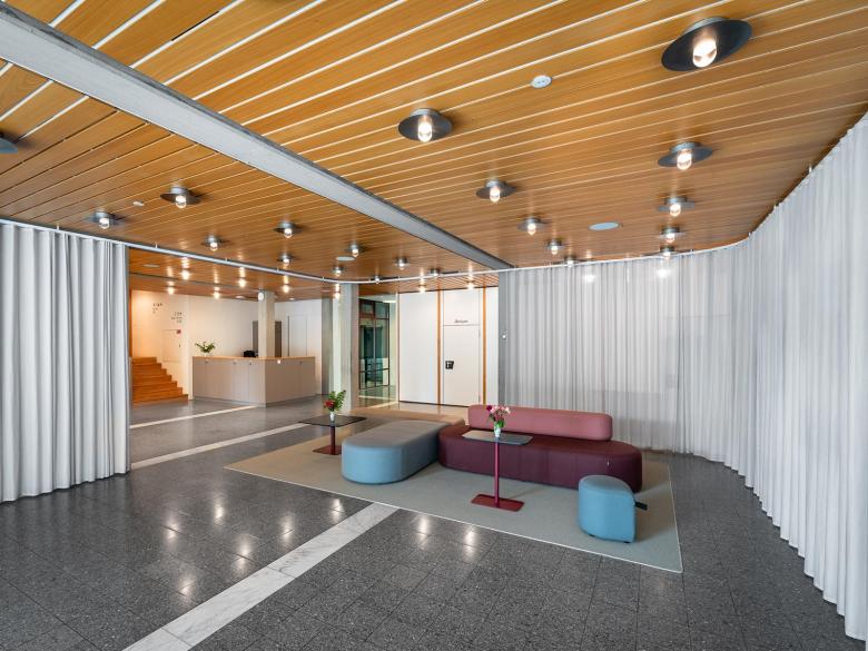 Die Innenräume wurden mit neuen Tageslichteinfällen, revidierten Beleuchtungen, neu strukturierten Räumen und angepassten Farbgebungen für vielfältige Nutzungen einladend gestaltet.