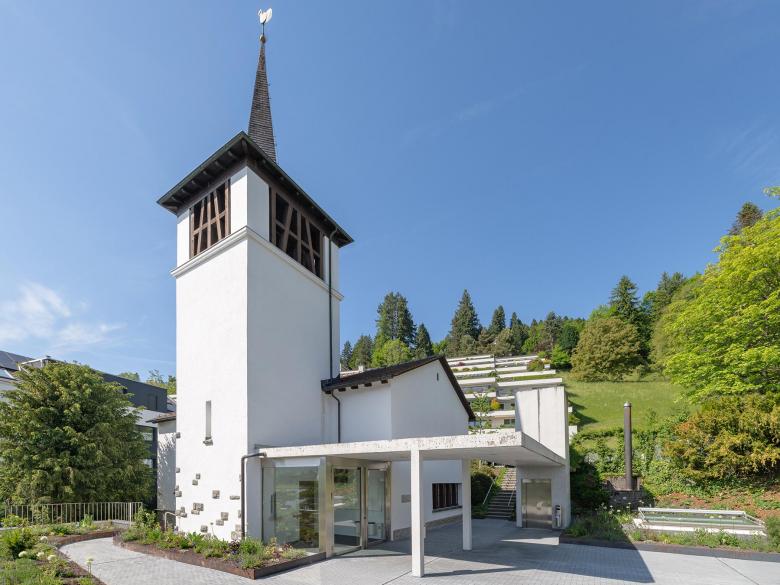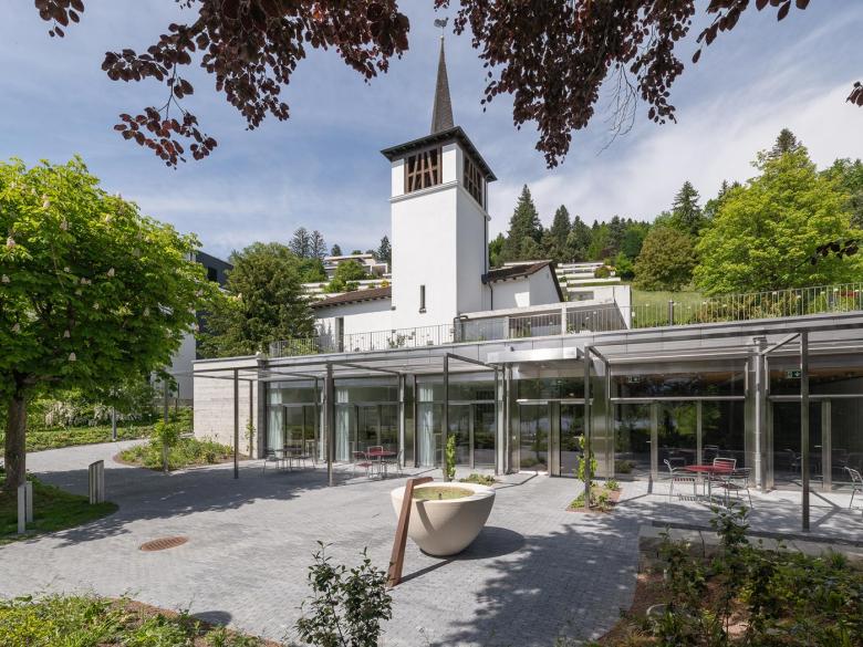 Die dominante frei schwebende Aussentreppe wurde entfernt. Die gewonnene Aussenfläche übernimmt das erweiterte Gebäude in Sichtbeton mit einer Chromstahlfront und davor gesetzten begrünten Pergola. Der neu gestaltete Aussenraum wurde mit neuen Wegverläufen und natürlichen Begrünungen in die Anlage exakt eingebettet und macht die Kirche sichtbarer.