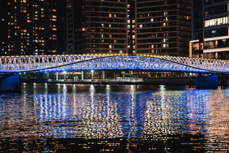 朝潮運河をまたぎ、GRAND MARINA TOKYOへとつなぐ「黎明小橋」は、水面に波打つような柔らかい曲線のデザインが、おだやかな波のイメージを表現している。