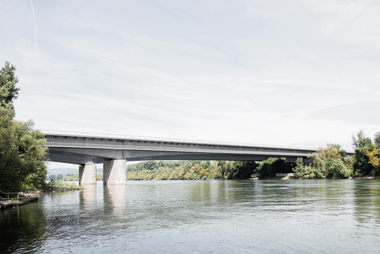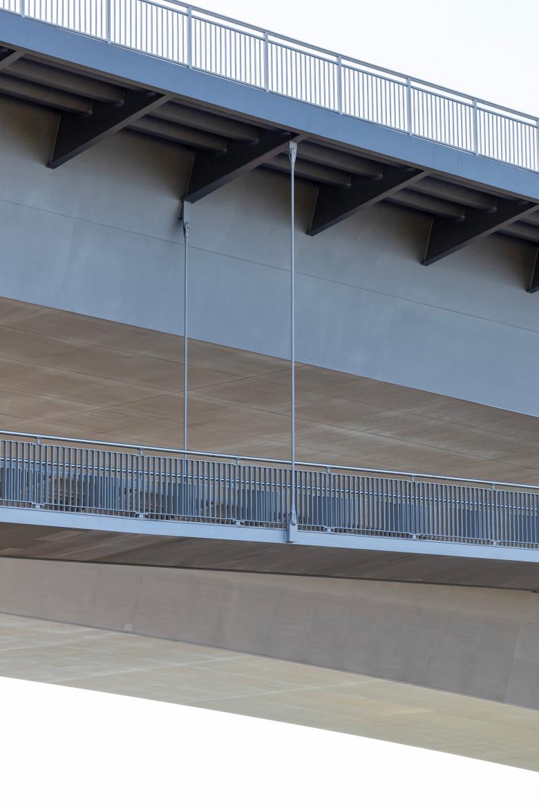 Auf den besonderen Charakter des Ortes - auf das Flusstal mit seinen angrenzenden grünen Uferzonen und den im Hintergrund leichtansteigenden Hügeln - wird mit der schlanken Deckbrücke geantwortet. Ihre symmetrische Ausbildung mit Feldern von je 205m über den Flussarmen und Stützweiten von 70 - 100m über den Grünzonen erzeugt ein harmonisches Ganzes. Ein heller, silberfarbener Anstrich der Hohlkörper steht in einem spannungsreichen Kontrast zu einer dunklen Gestaltung der Fahrbahnplatte; die Kontinuität der gevouteten Felder, die Linearität und die Schlankheit der Brücke werden dadurch unterstrichen.