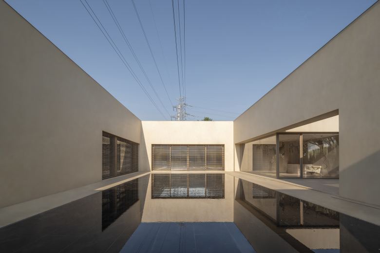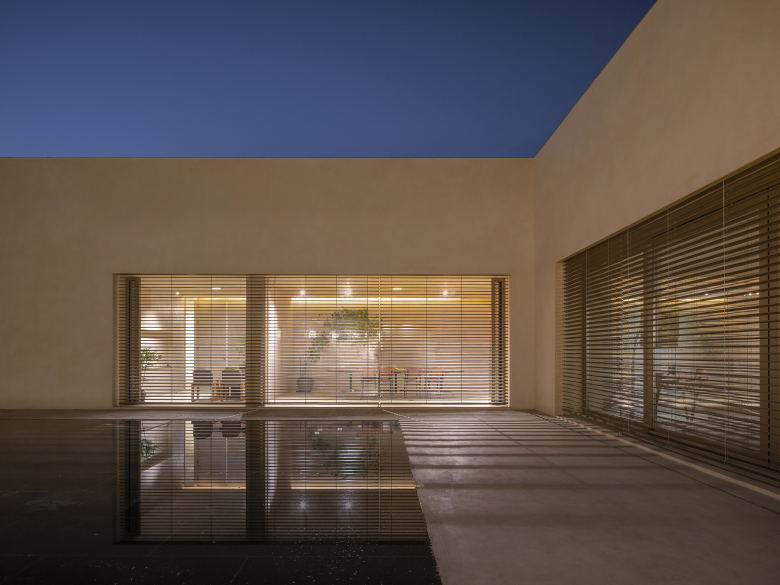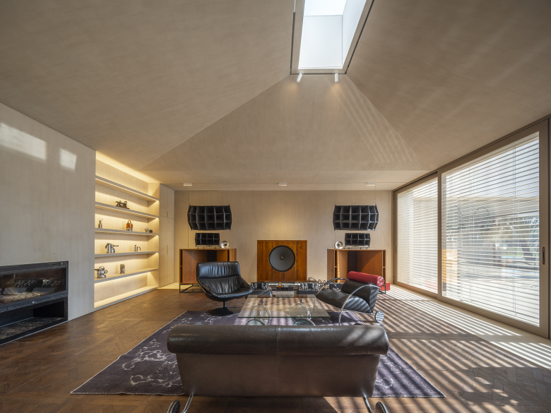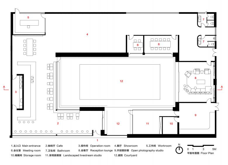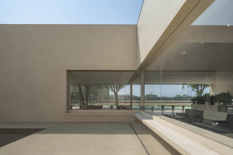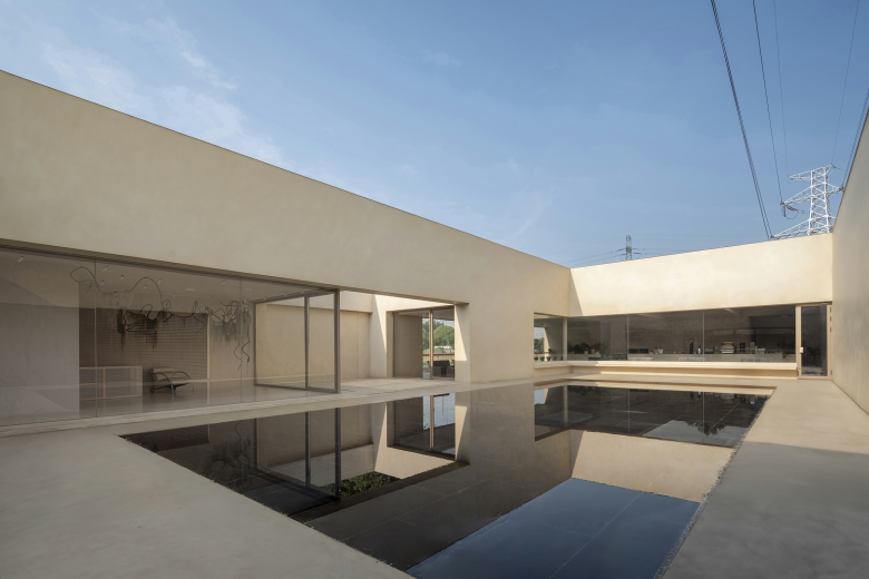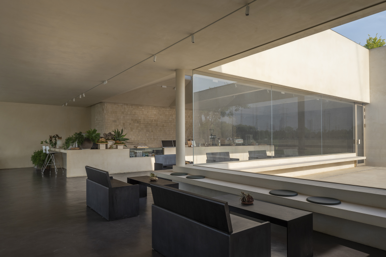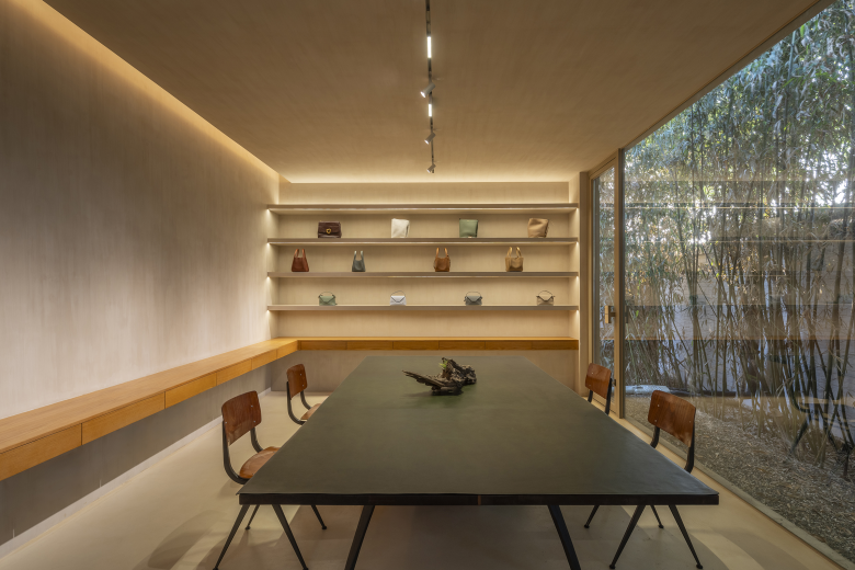Around the courtyard, walls were designed with different frames that extend into various functional rooms such as meeting room, reception lounge, and livestream studio. These frames open rhythmically to the courtyard, and the motorized louvers outside the frames ensure adjustable privacy based on the rooms' usage.
