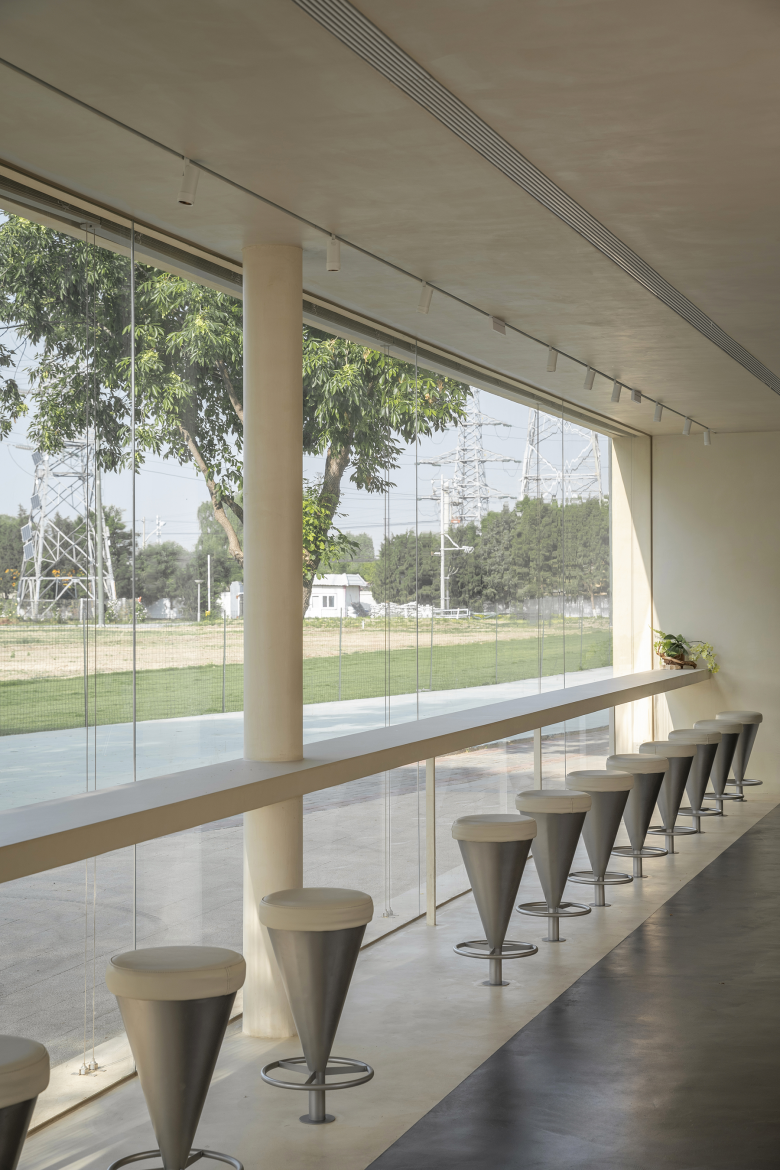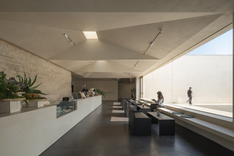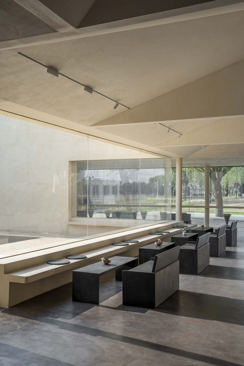The cafe, a key part of the project, was designed with meticulous details. The design team introduced horizontal frames to maximize the cafe's openness to both the park and the internal courtyard, creating an engaging dynamic between "seeing and being seen." The frames extend into the interior, forming a bar counter and booth seating. This design blurs the boundaries between furniture and architecture, promoting a smooth, natural flow within the space. Visitors can enjoy food while taking in the beautiful outdoor views, enhancing their overall sense of pleasure and relaxation.
