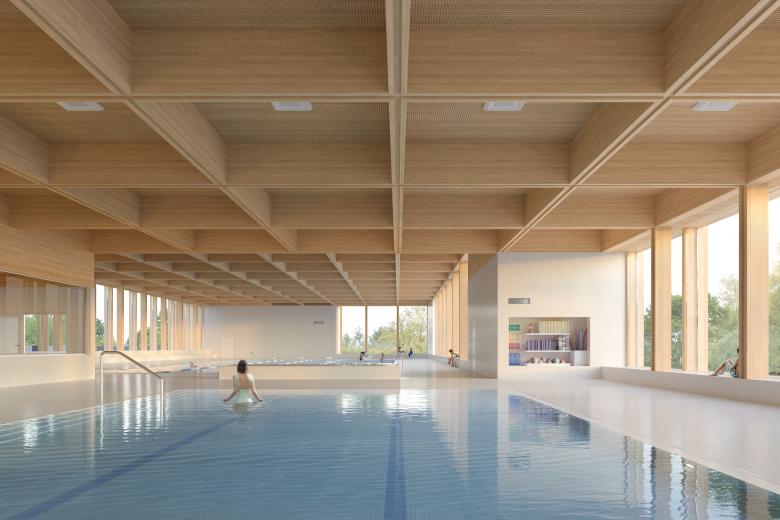 Im Winkel zwischen der Stöckackerstrasse und der alten Murtenstrasse wurden die geforderten Räume so zusammengefügt, dass sie eine möglichst geringe Fläche besetzen und die verschiedenen Nutzungen von den kurzen Distanzen profitieren. Aufgrund der unterschiedlichen Raumhöhen der einzelnen Hallen entstand ein Gebäude, das sich aus mehreren pavillonartigen Körpern zusammensetzt und so das grosse Volumen spielerisch gliedert. Dabei ergibt sich eine Abflachung von der Strasse zum Freibad hin, so dass das Gebäude mit dem Park zu verschmelzen scheint. Aus der Schwimmhalle im Obergeschoss öffnet sich der Blick über die Hügellandschaft und das Freiwasserbecken.