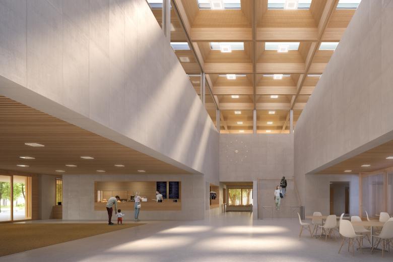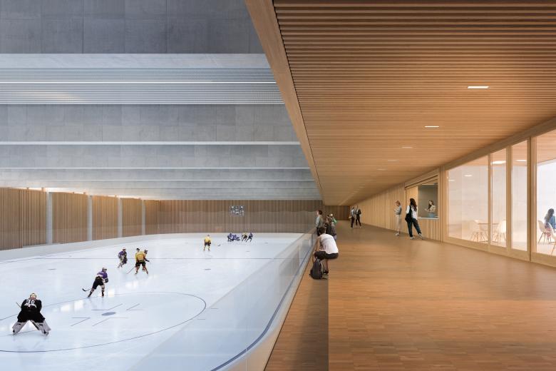 Dank der zahlreichen Eingänge und Wege des Parks ist der Zugang zum Gebäude aus jeder Himmelsrichtung gewährleistet. Aus diesem Grund der Zentralität und wegen der fantastischen Aussicht, wurde der Haupteingang zur Parkmitte hin positioniert. Nach dem Betreten des Gebäudes bietet die überhohe Eingangshalle einen Einblick in die verschiedenen Nutzungsbereiche. Durch eine Glasfront schaut man nach unten in die Eishalle, während sich nach oben der Raum zum Hallenbad öffnet.