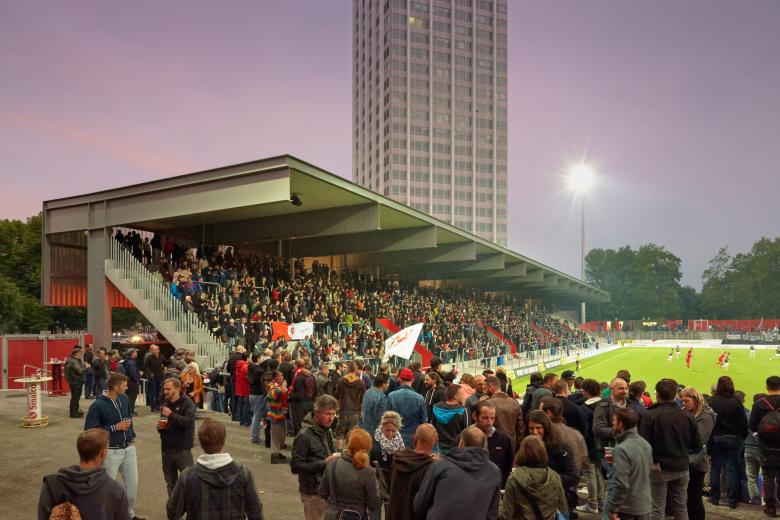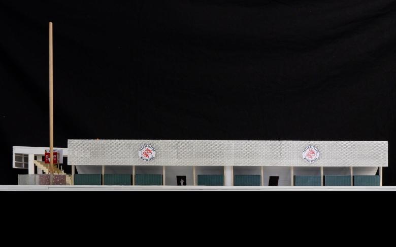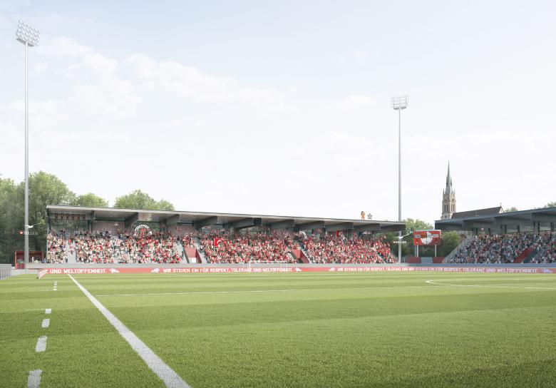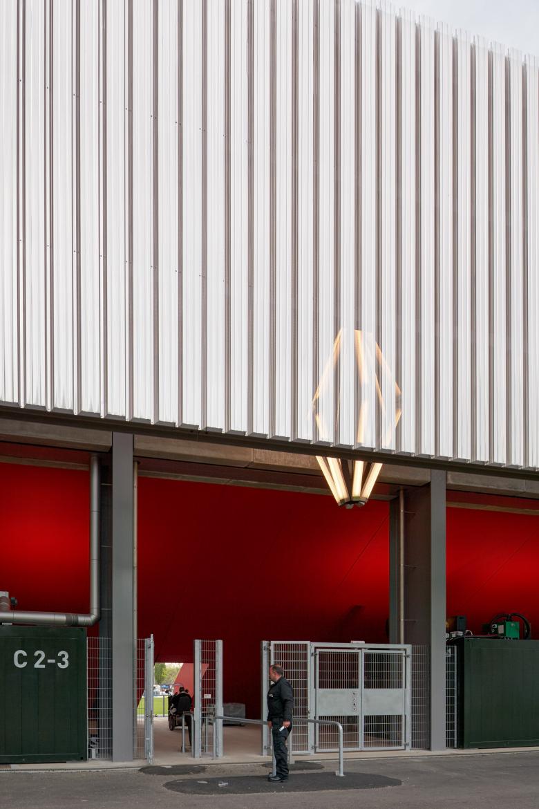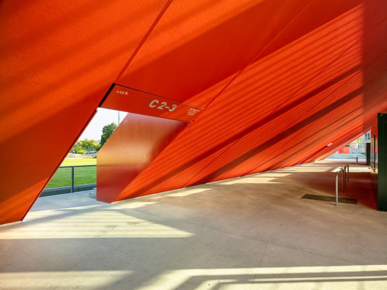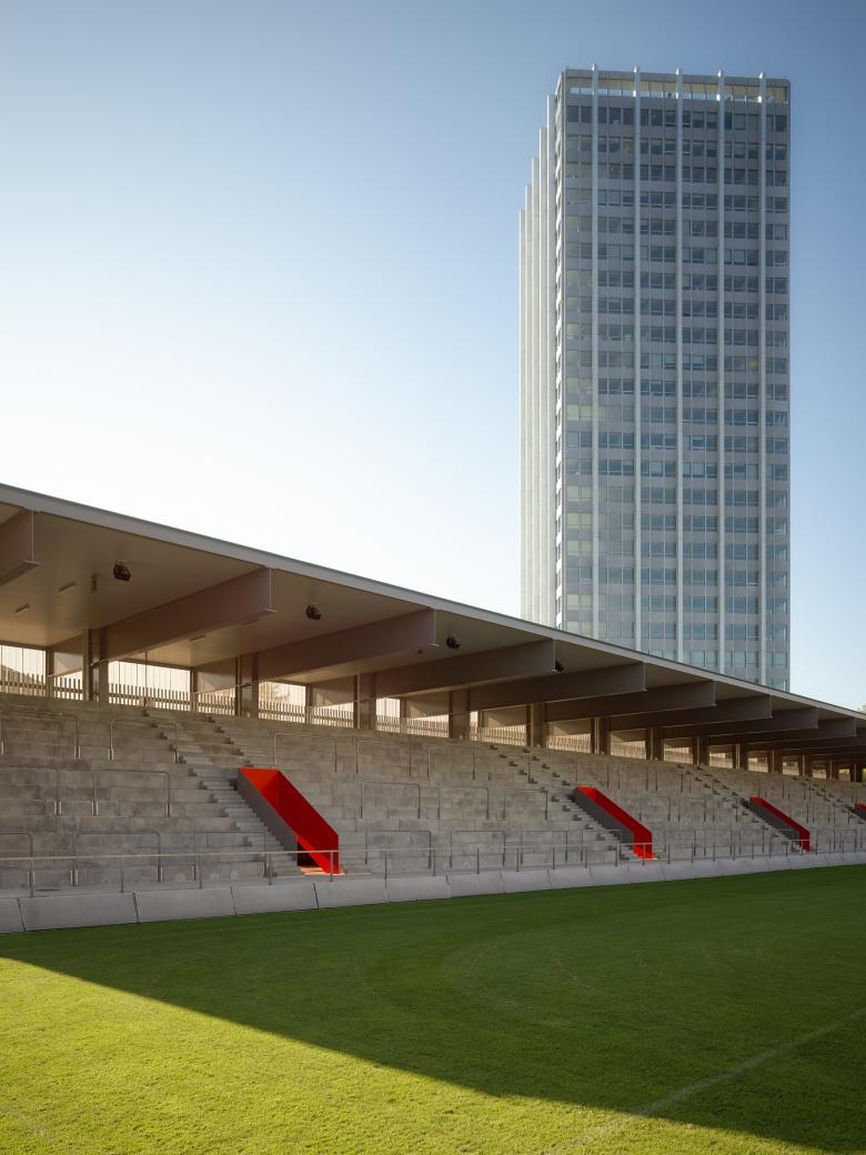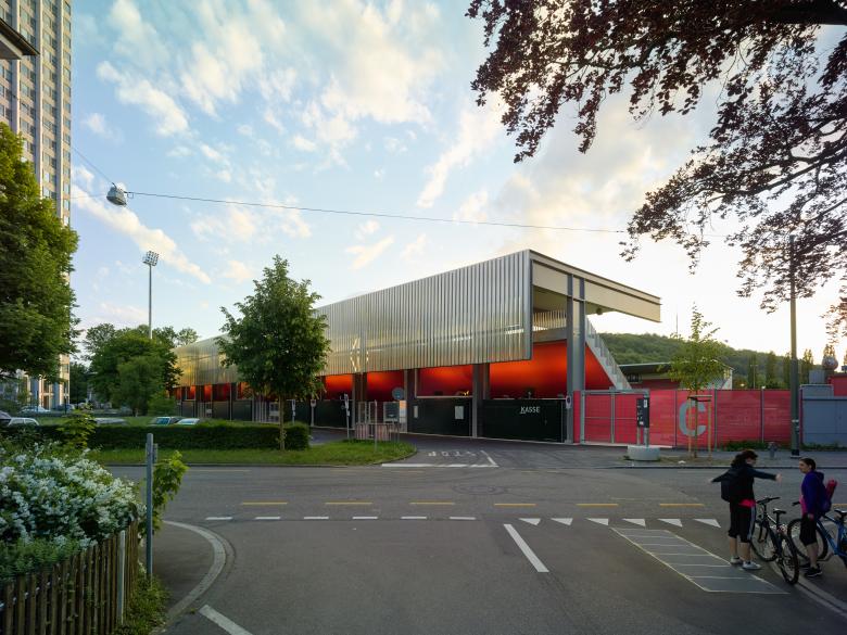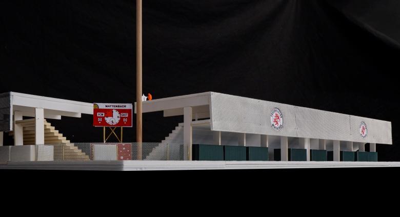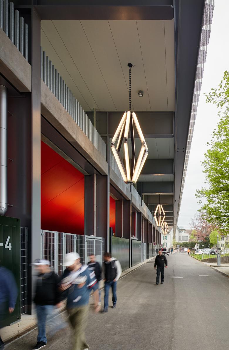Mächtige Stahlträger als einfache, archaisch anmutende Konstruktion, die Reduktion der Mittel und der regelmässige Rhythmus der Struktur geben den neuen Tribünen ihren spezifischen Ausdruck. Dem zugrunde liegt die Idee eines kosteneffizient herstell- und montierbaren Moduls, das nebeneinander angeordnet eine beliebig lange Tribüne entstehen lässt.