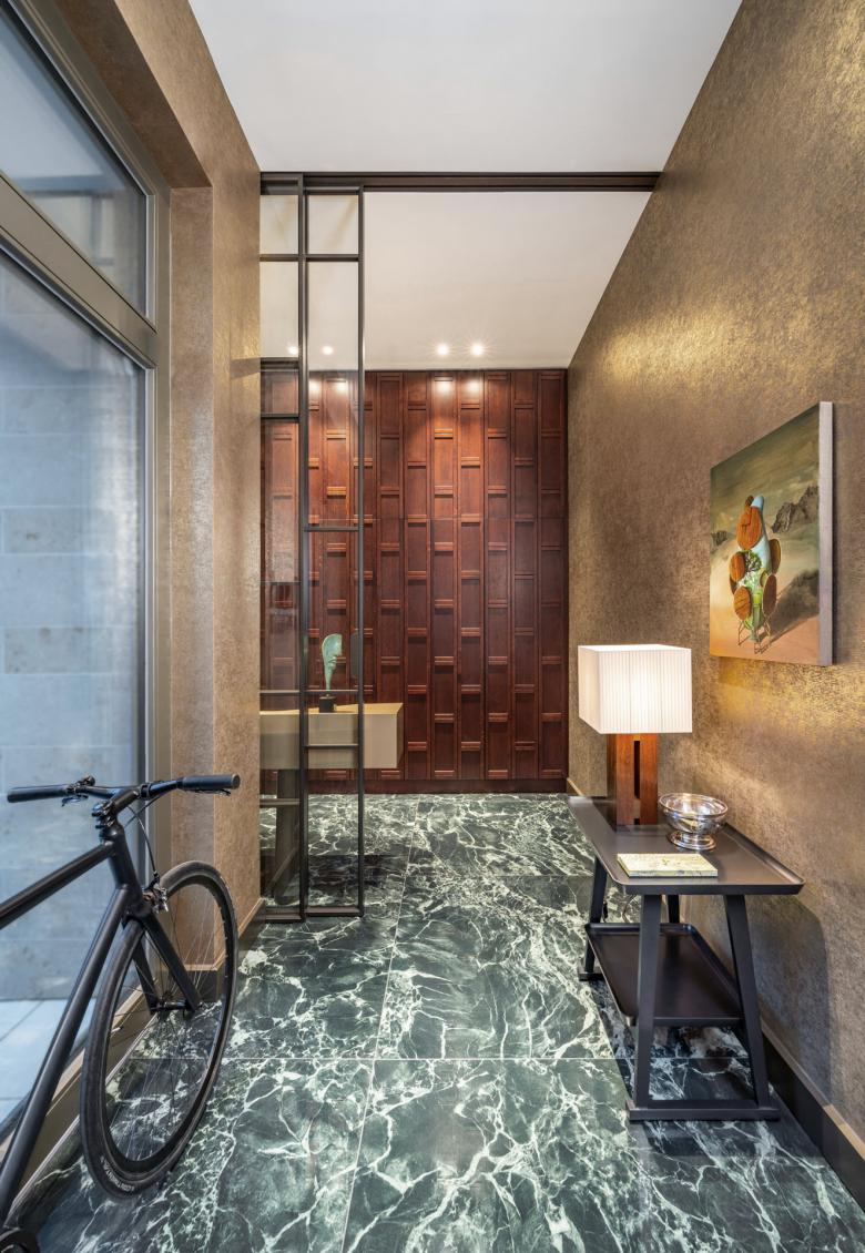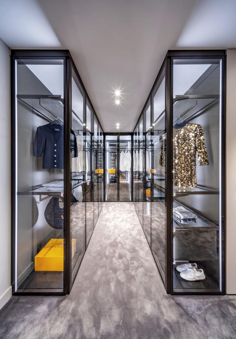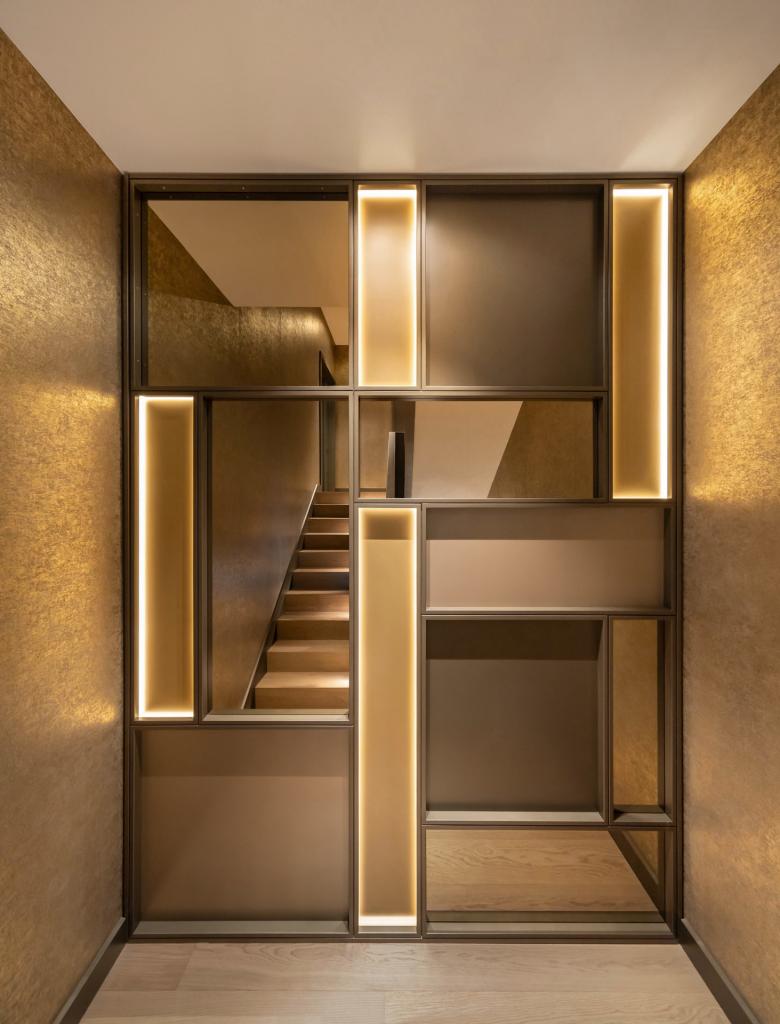 Ein edles Townhouse im Frankfurter Diplomatenviertel wurde von Hollin+Radoske vom Rohbau an individuell geplant und in enger Abstimmung mit den Kunden in eine ungewöhnliche High-End Residenz verwandelt. Auf fünf Ebenen verteilen sich die unterschiedlichen Bereiche vom Gästeappartement, über die Eingangshalle, den Privaträumen, der Wohnebene bis hinauf zur spektakulären Dachterrasse mit Skylineblick, üppigem Grün, verschiedenen Sitzbereichen und dem Jacuzzi-Pool. Hollin+Radoske entwickelte eine durchgehende Designphilosophie. Die vorherrschenden Elemente weißer Marmor, Gold und darauf abgestimmte, umfangreiche Einbauten, führen zu einem harmonischen und vor allem auch persönlichen Gesamtkonzept.