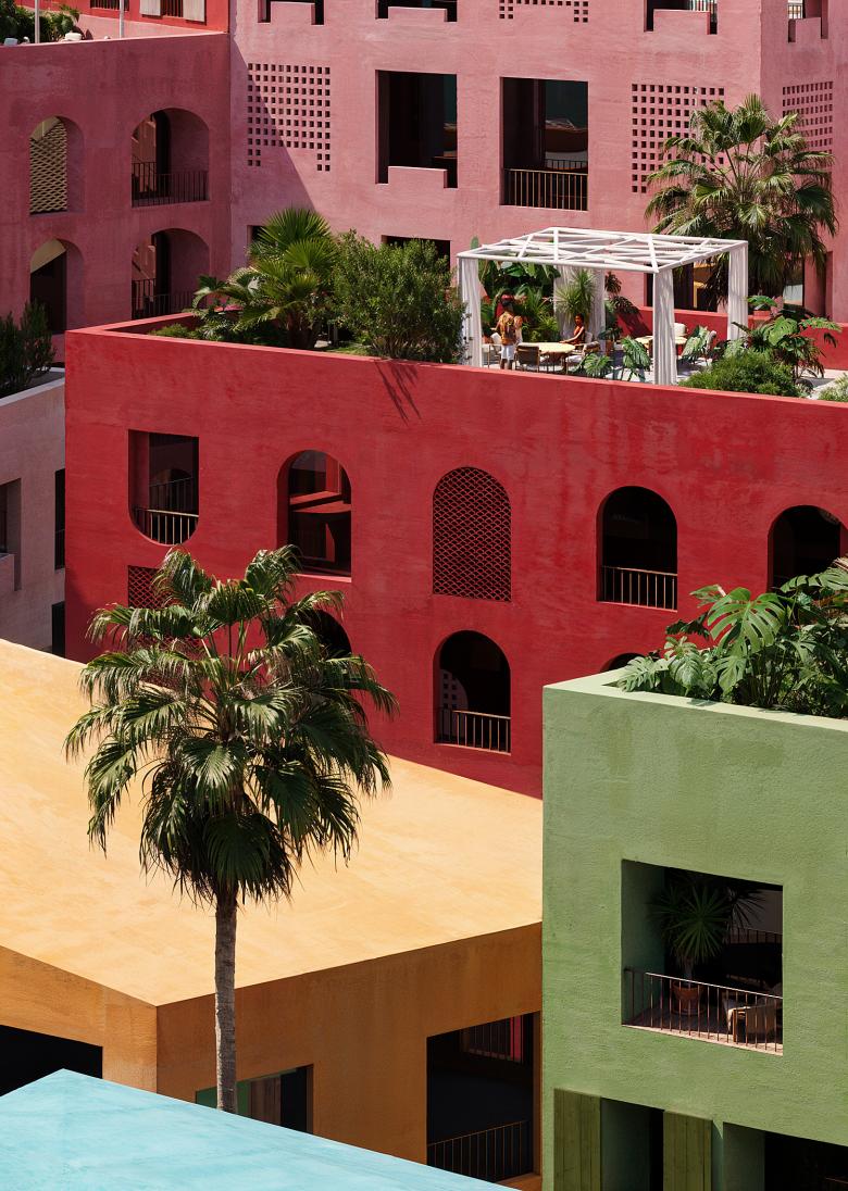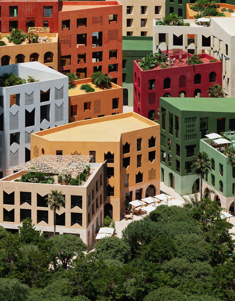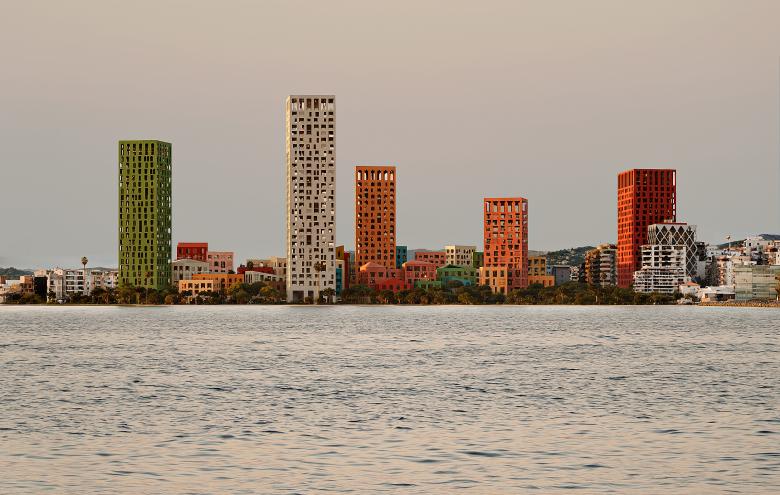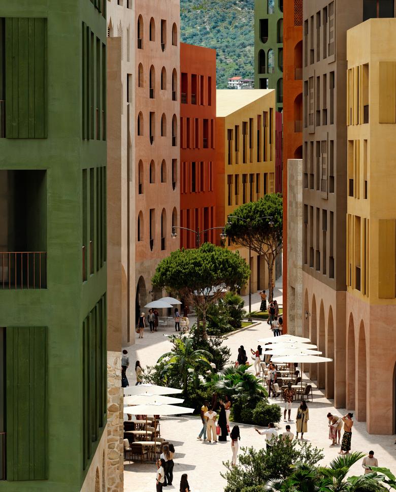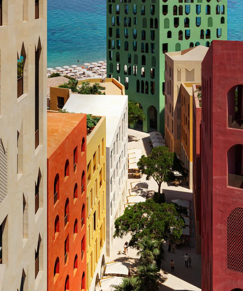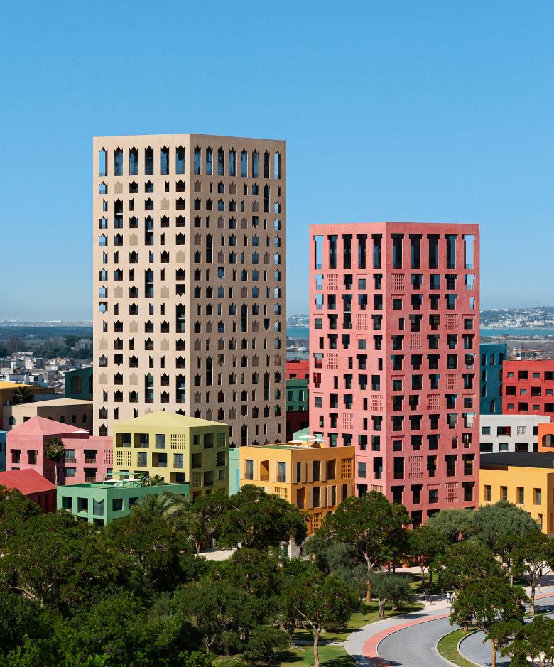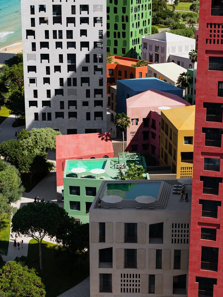 Zwischen diesem Gefüge ragen drei Türme als Gegenstücke zur Dorftypologie empor, bieten Panoramablicke auf die Adriaküste, optimieren natürliche Licht- und Luftzirkulation und erweitern die Wohnvielfalt. Diese Türme sind so positioniert, dass öffentliche Freiräume und Sichtbeziehungen erhalten bleiben; ihre Fassaden nehmen die gleichen Rhythmen und Proportionen der niedrigeren Gebäude auf und schaffen so eine einheitliche architektonische Sprache über die Maßstäbe hinweg.