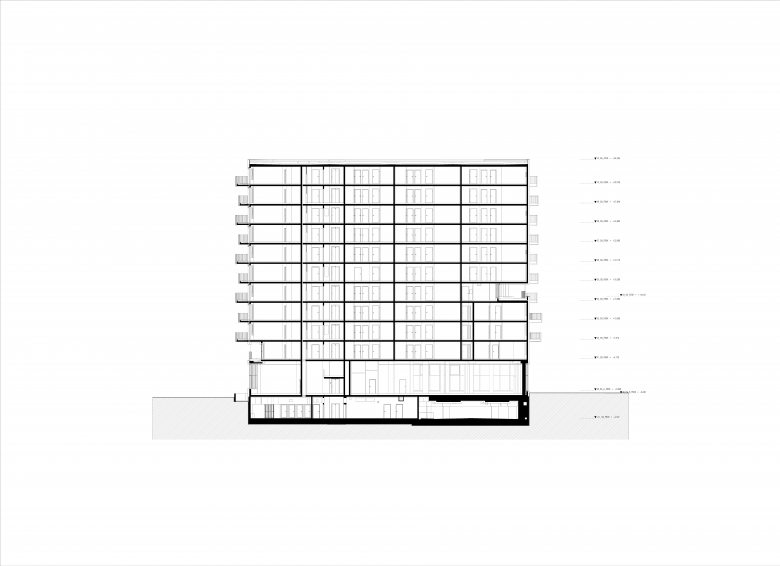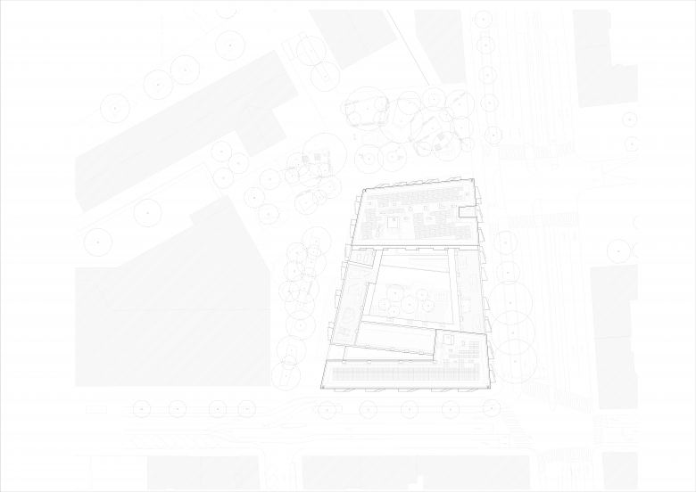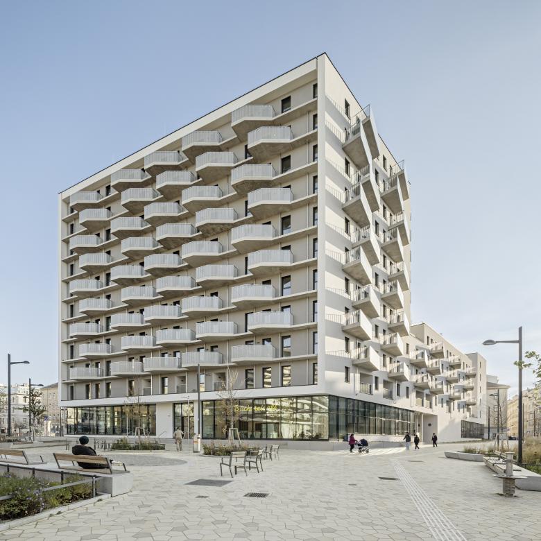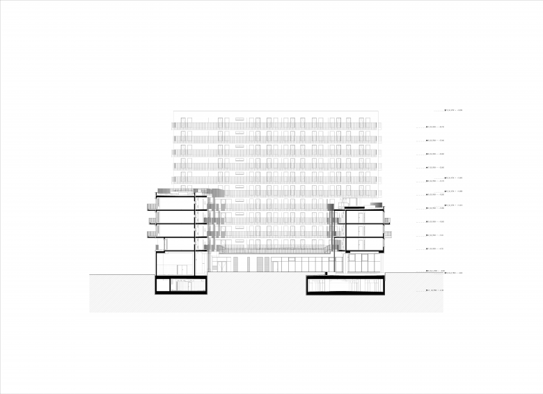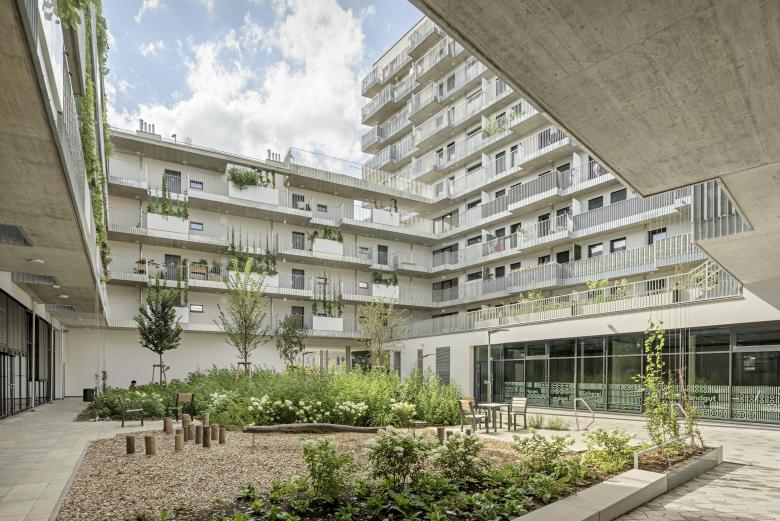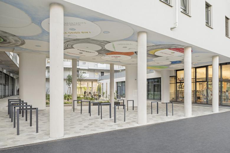 Das System der verdichteten Baustruktur zugunsten größerer Freiräume wird auch am gegenständlichen Projekt angewandt. So werden die beiden höheren Bauteile des Gebäudes äußerst effizient und kompakt errichtet. Zugleich wird der dadurch freigespielte Raum den Bewohnerinnen und Bewohnern des Gebäudes als Freiraum zurückgegeben. Durch diese Maßnahmen ist es gelungen den Innenhof des Gebäudes gegenüber der vorgeben Baulinien weiter zu öffnen und auch eine großzügige öffentliche Durchwegung durch den Bauplatz zu implementieren.