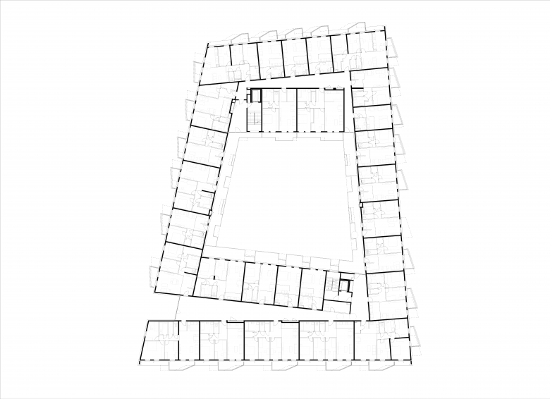 Der Baukörper folgt den Vorgaben der Flächenwidmung. Die vorgegebene Blockstruktur wird aufgebrochen und ermöglicht die Durchwegung des aktivierten Innenhofs. Die beiden Hochpunkte werden mittels einer Mittelgangerschließung ausgeführt, welche sich jedoch in ihrer Formgebung klar von der klassischen Gestaltungsweise solcher Erschießungswege unterscheidet. Die Gänge weiten sich ausgehend von den vertikalen Erschließungskernen auf und bilden durch die großzügige Verglasung am Ende der Gänge eine richtungsbezogene öffnungsgerichtete Struktur.