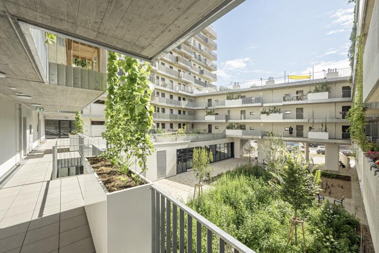 Der vorgesehene Erdkern in der Mitte des Hofes bietet Platz für die großwachsende Baumbepflanzung im Innenhof. Die unversiegelte Fläche wird zugleich als mögliche Versickerungsfläche herangezogen. Neben Baumbepflanzung sorgen auch großzügige Pflanzbeete mit hochwachsender Sträucher- und Gräserbepflanzung für ein angenehmes Grünklima am Bauplatz. Die Typologische Struktur des Innenhofs ist stark an einen klassischen Wiener Pawlatschenhof angelehnt. Die vertikale Bepflanzung der Laubengänge geht zum Teil ebenfalls von der unversiegelten Grünfläche aus. Die Vertikalbegrünung besteht aus Schlingpflanzen. Die Artenauswahl orientiert sich an Kriterien wie Ausrichtung und Lichtgenuss, Klimaverträglichkeit, Ungiftigkeit und Robustheit. Beispielarten sind Kiwi, Akebie und Pfeifenblume. Eine automatische ganzjährige Bewässerung ist vorgesehen. Die Bereiche der Fassadenausschnitte werden ebenfalls großflächig begrünt. Dazu werden an der Westfassade Rankpflanzen vom 1. Obergeschoß ausgehend bis ins 5. Obergeschoß wachsen. Auf der großen Dachterrasse wird eine Seite des hohen Bauteils vertikal begrünt.