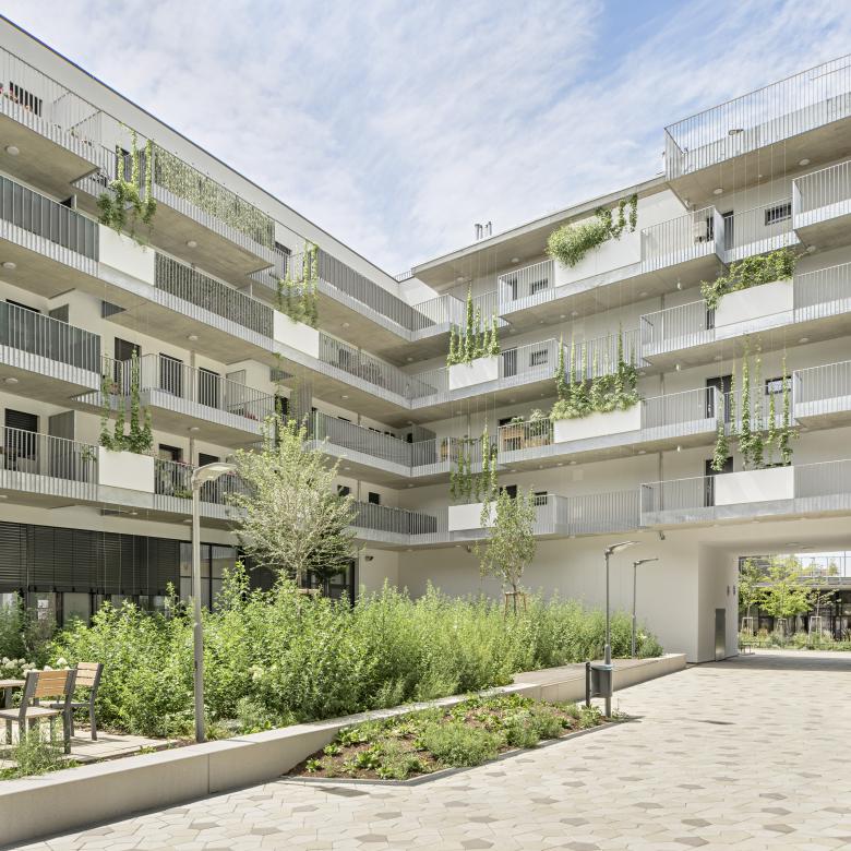 Durch eine Aussparung in der Tiefgarage können drei große Baumpflanzungen mit unterschiedlichen Wuchsformen gepflanzt werden, die eine landschaftliche Dimension in den Hof bringen und allen im Quartier einen Grünblick mit kühler, frischer Luft und Vogelgezwitscher bieten. Erdgebundene Vertikalbegrünung und umfangreiche Trogbepflanzungen am Laubengang und bei den Balkonen sorgen für zeitgemäße und ausreichende Klimawandelanpassungen. Zwei unterschiedliche helle Pflasterbeläge gliedern den Hof in Bewegungs- und Aufenthaltszonen.