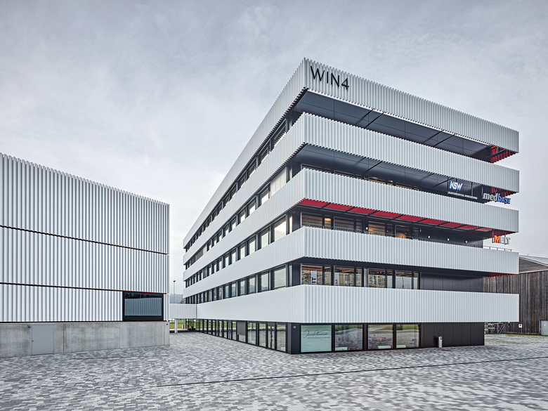 The WIN4 Sports Centre in Winterthur is located beside the existing Deutweg ice arena. Catering for both mass and top-level sport, this new project is intended to have an impact far beyond the city of Winterthur. On this account a kind of architecture was aimed for that translates these national and international ambitions into a memorable architectural language. Three distinctively different building volumes form an ensemble and define a shared outdoor space. The first phase to be implemented consists of a new building for the ball sports arena with an adjoining campus building and a training hall to the south. Currently at the planning stage is the sports wing 2, which, when erected, will complete the ensemble consisting of arena and campus building. The three buildings are connected by a central covered foyer area. The strategy of using three independent buildings allows a clear urban statement to be made as early as the first stage. The multi-function training hall already augments the ensemble in the south, where it forms a termination to the existing, extensive sports pitches of the neighbouring sports park. As the final stage a six-part gym hall will complement and complete the sports cluster. The large ball sports arena, which swivels outwards to the south, is the new home for the handball players from Pfadi Winterthur, the Uni hockey association and other Winterthur sports associations. The heart of the arena is a central pitch, surrounded by raised spectator stands that provide space for up to 2000 spectators. All the necessary ancillary spaces such as changing rooms, press rooms etc. are accommodated at entrance level. Staircases positioned at the sides bring visitors up to the first-floor level. There, from the generously dimensioned surrounding circulation terrace, they can access the stands, numerous refreshment areas, the VIP enclosure, and the sanitary facilities. An underground garage in the basement of the ball sports arena offers 125 parking spaces. The neighbouring five-storey campus building houses a variety of sport functions, all of which are reached from a centrally positioned staircase. Sports medicine, fitness with integrated wellness facility, and a sports school with classrooms augment the functions of the sports cluster. The multi-functional training hall is a ‘decorated shed’ that relates visually to the buildings of the first phase in the north, while at the same time taking account of the existing district centre to the south. The outdoor spaces around the new sports centre consist of an arrivals area with an urban character, a landscaped district park, and the large lawns of the sports pitches. With its public pathways the new sports park has an additional value for the neighbouring residential districts as a place to spend leisure time.