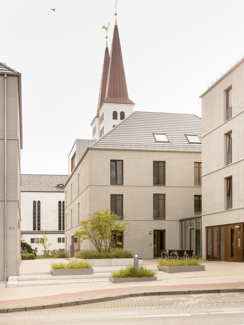 Der entwurfliche Ansatz verfolgt das Ziel einer behutsamen Stadtreparatur, bei dem sich die neuen Baumassen städtebaulich und architektonisch harmonisch in die vorhandene Struktur des Umfeldes einfügen. Zu diesem Zweck wurden statt eines, das gesamte Grundstück überdeckenden großen Gebäudevolumens drei Baukörper vorgeschlagen, die sich in ihrer Größe und Form an der unmittelbar angrenzenden Bebauung entlang der Oststraße orientieren. Dabei nimmt der im Norden gelegene viergeschossige Baukörper die Flucht der Nachbarbebauung auf und der östliche, ebenfalls viergeschossig, die Flucht der Kirche entlang der Fritz-Reuter-Straße. Der Baukörper an der Einmündung Fritz-Reuter-Straße / Oststraße hat fünf Etagen. Zudem springt er aus den Fluchten der angrenzenden Gebäude heraus und betont so die Ecke im Einmündungsbereich der beiden Straßen.