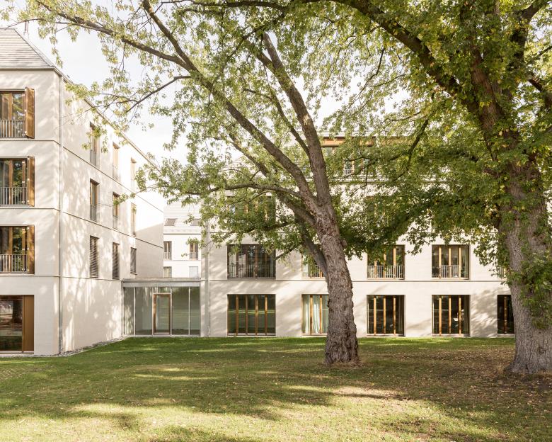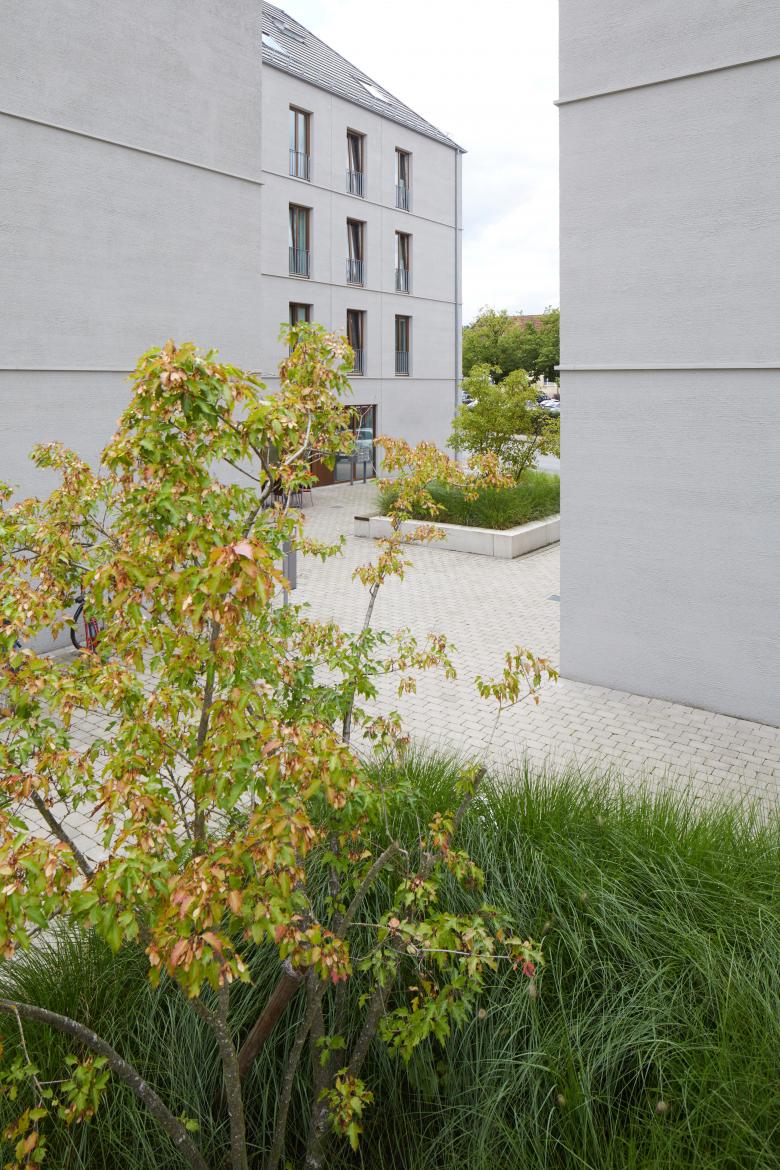 Durch die Anordnung der Baukörper konnten alle vorhandenen Bäume erhalten werden. Sie markieren den Anfang eines das Wohnquartier durchquerenden Grünzugs und tragen zur Bereicherung der Wohnqualität bei. Die Gebäude gruppieren sich um einen zur Oststraße hin offenen kleinen Platz, der als halböffentlicher Außenraum das Entree zu den einzelnen Häusern bildet. Hieran schließt im Osten ein Garten mit Kinderspielplatz an, der ausschließlich den Bewohnern zur Verfügung steht und durch seine Lage abseits der Straßen vor dem Verkehr geschützt ist. Der südliche und der östliche Baukörper sind im Erdgeschoss miteinander verbunden. Hier war ursprünglich eine Filiale der Volksbank vorgesehen, deren Realisierung aber im Laufe der Umsetzung des Projektes aufgegeben wurde. Jetzt ist im Eckgebäude eine Bäckerei untergebracht, die mit einer kleinen Außengastronomie den Vorplatz belebt. Auch in den Erdgeschossen des nördlichen und des östlichen Baukörpers sind kleinteilige gewerbliche Nutzungen untergebracht.