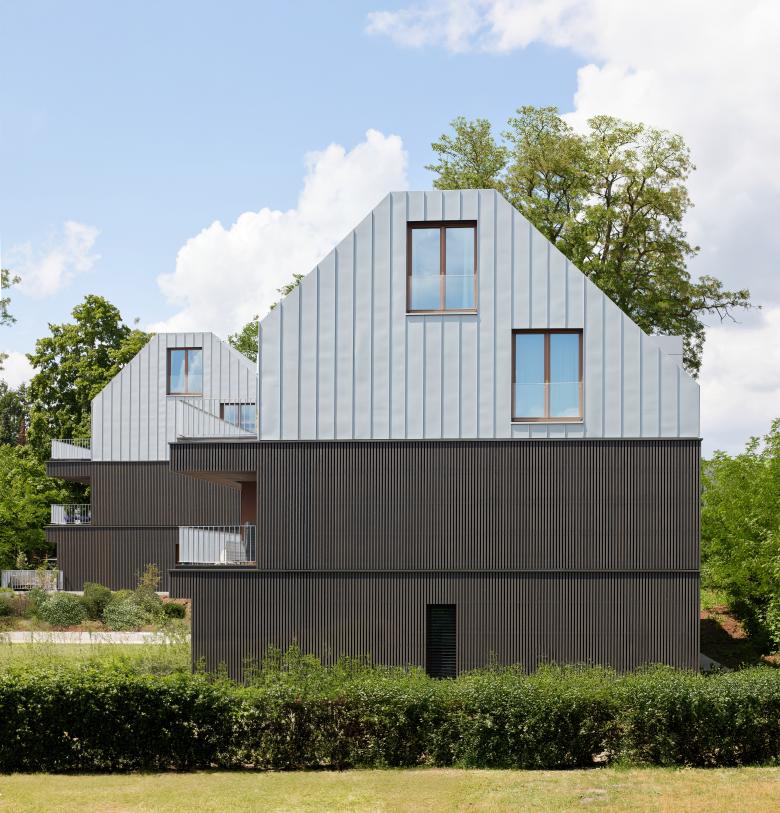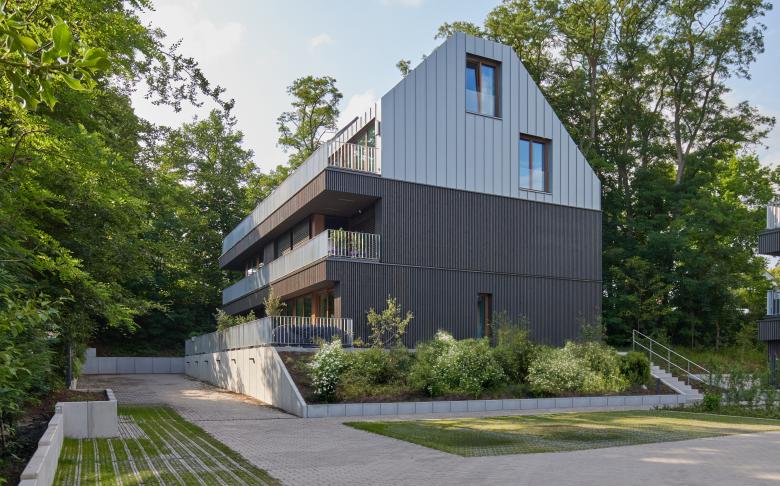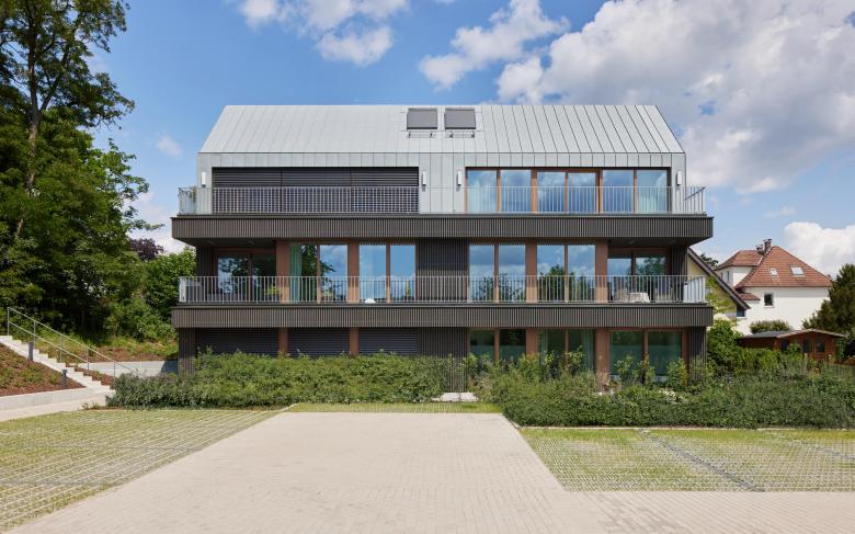 Gebäudeabstände dem Parkhaus vorgelagert ist. Er nimmt die Flucht und die Höhe der westlich angrenzenden Häuser auf und verlängert diese etwa bis zur Mitte der Freifläche. Die Zufahrt zum Parkhaus bleibt frei und es kann ohne Einschränkung weiter genutzt werden. Zur weiteren Aufwertung des Grundstücks erhält das Parkhaus eine neue Fassade.