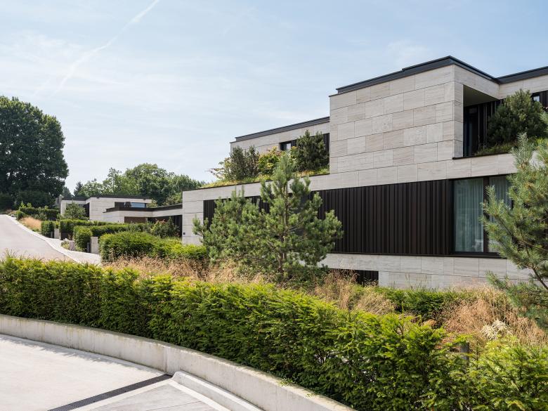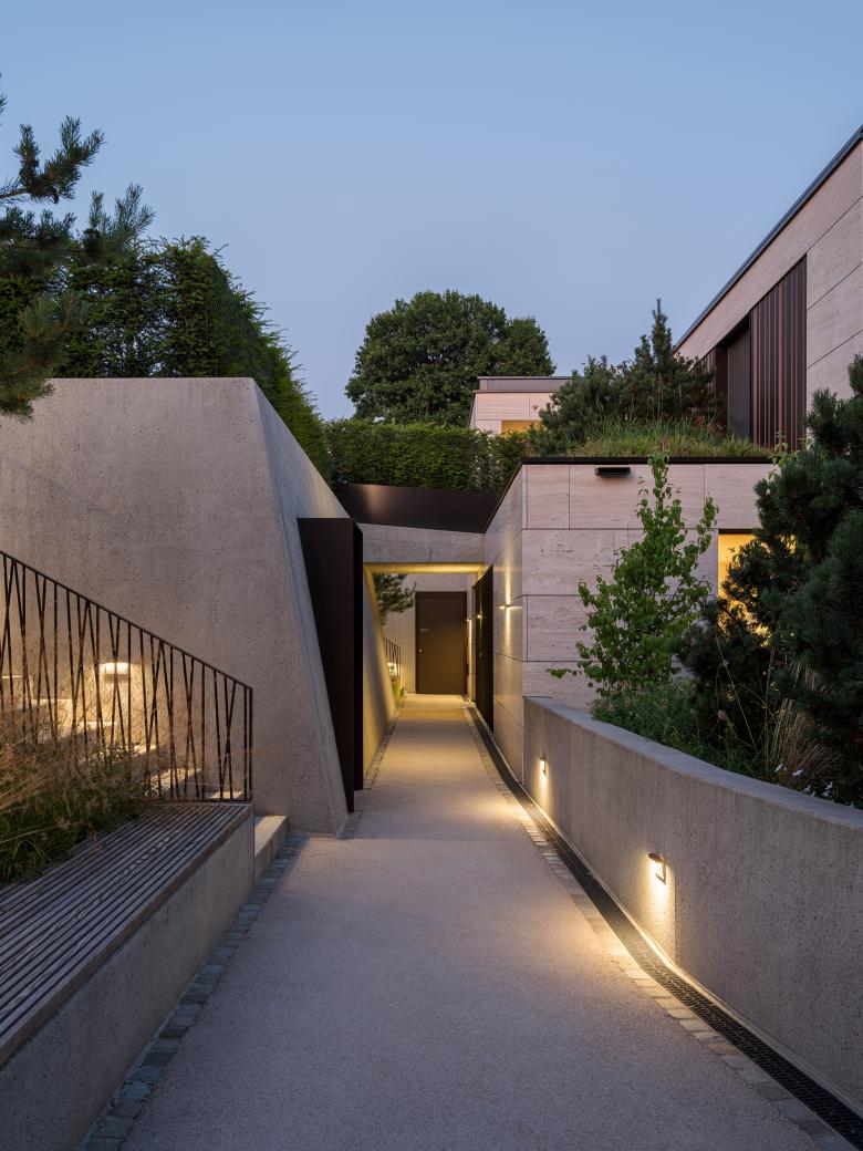 Die drei Gebäude folgen den Höhenkurven und der steilen Topografie – sie sind dadurch zueinander leicht abgedreht und bilden so eine spannungsvolle und doch harmonische Komposition, ein «Ensemble». Um für jedes Geschoss optimale Aussicht, Besonnung und Privatsphäre zu erreichen, wurden die Häuser talseitig terrassiert ausgeführt. Bergseitig, quasi auf Augenhöhe der Kappelistrasse entstanden verwobene Aussenräume und Gänge. Um den Einblick von dort zu minimieren, wurde diese Seite der Siedlung mittels der Landschaftsgestaltung stark begrünt. So entstand eine mediterran anmutende Zugangsssituation in die drei Häuser. Die Einfahrt in die Tiefgarage windet sich vom obersten Punkt spiralartig herab unter die Häuser.