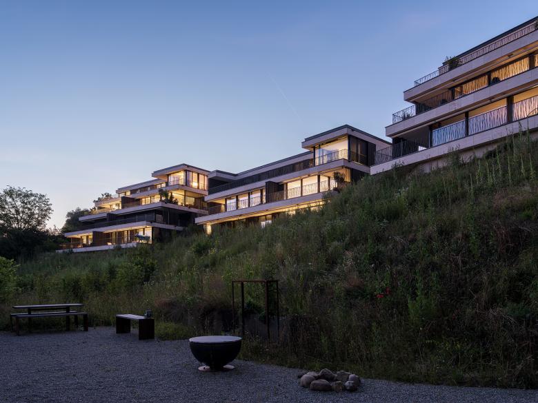 Das Gebiet «Erlenhöhe» beherbergte ein ehemaliges Gourmetrestaurant. Es liegt am äusseren Dorfrand von Erlenbach an bester Aussichtslage hoch über dem bewaldeten Tobel des Dorfbaches mit Blick auf den Zürichsee und die Alpen. Die wechselnden Farben der Blätter und das Rauschen des Waldes verleihen dem Ort im Laufe der Jahreszeiten eine herrliche und reizvolle Kulisse. Die steile Hanglage, der talseitige Wald sowie die Erschliessung von oben waren eine besondere Herausforderung. Die genaue Analyse des Ortes und die Spielregeln der Bauordnung ergaben ein Konzept von drei Häusern mit je fünf Wohnungen.